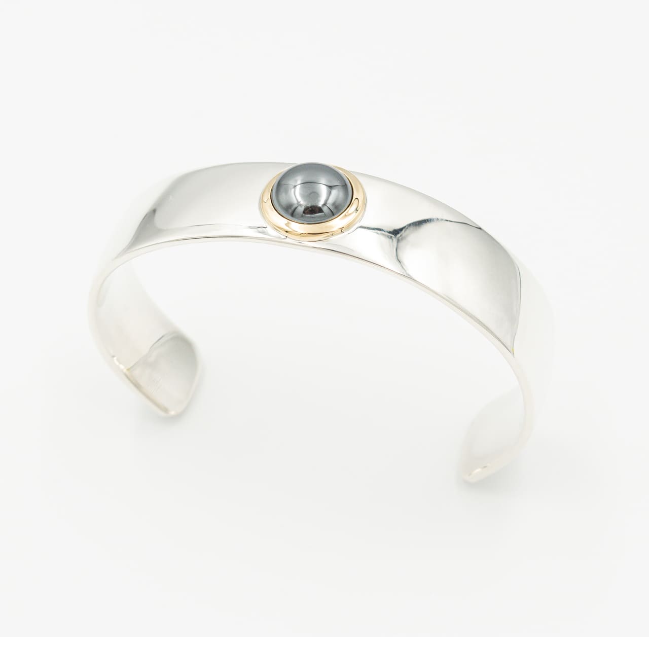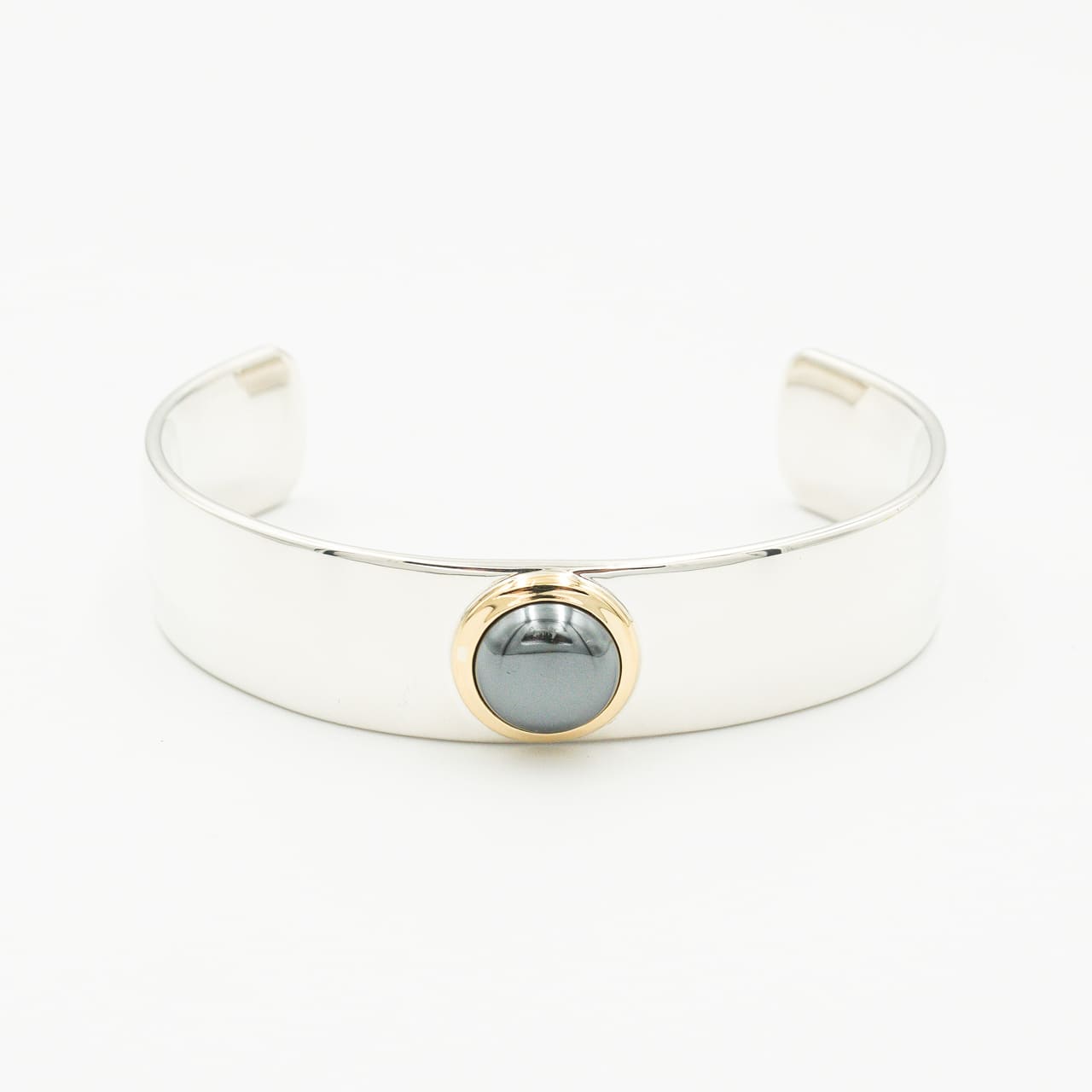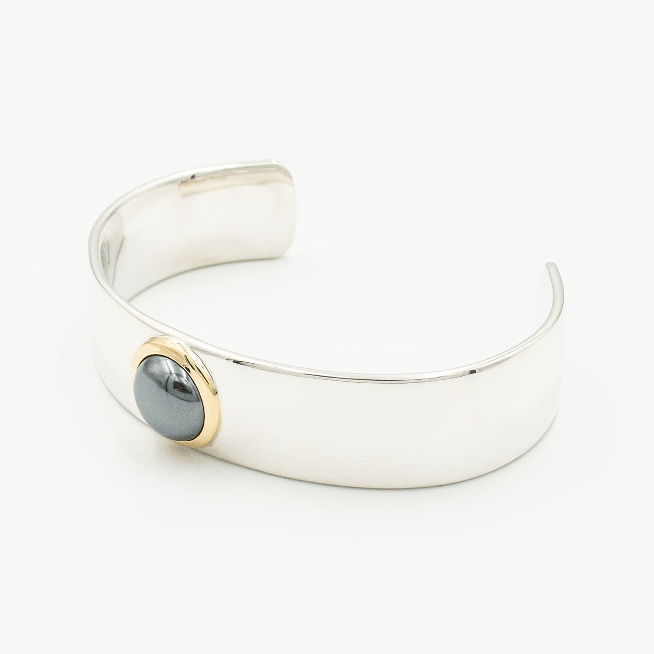 深みのあるダークグレーの輝きが美しいヘマタイトを、18Kのベゼルで包み込んだカフブレスレットです。金の温かみとヘマタイトのクールな金属光沢がコントラストを生み、手元に上質な陰影を添えます。刻印の表記から1999年頃に販売されていた個体と推測されます。