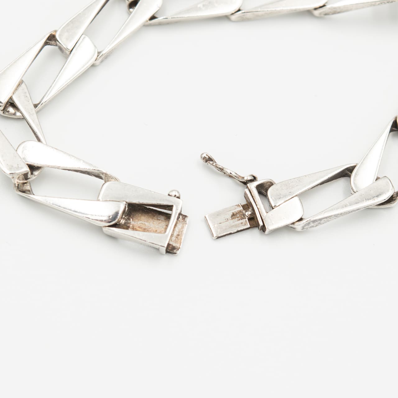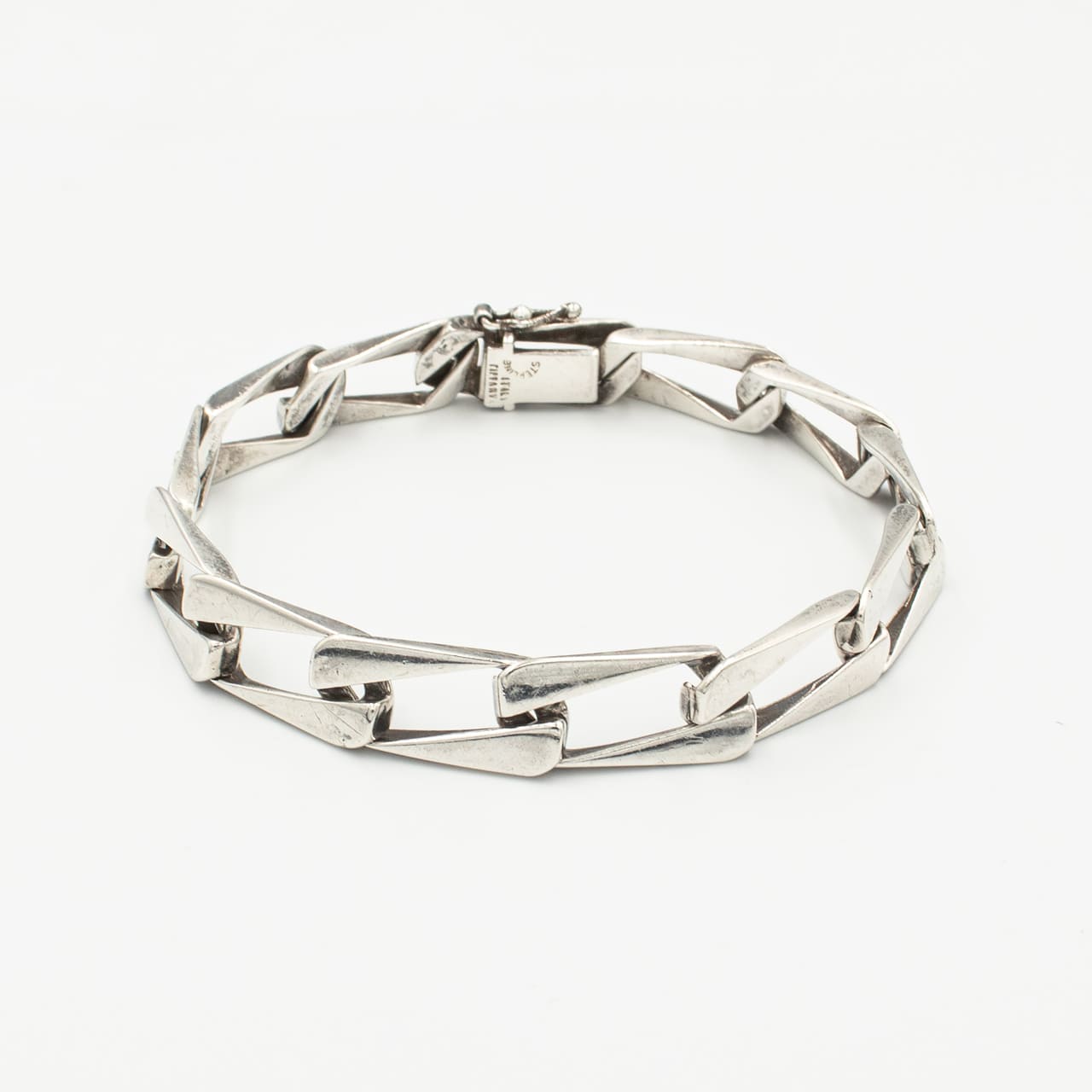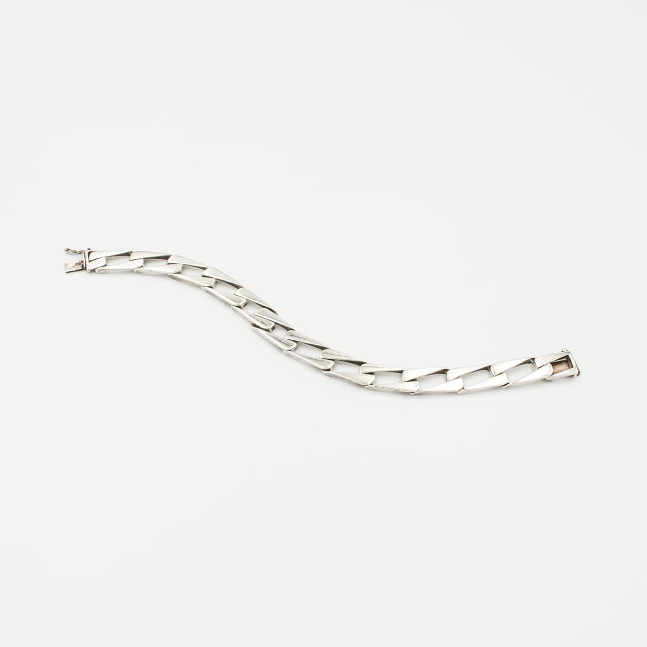 エッジの立ったリンクを連ねた無骨な表情のカーブリンク・ブレスレットです。面取りされたリンクが光を鋭く返し、手首の動きに合わせて陰影をつくります。刻印と形状から1970年代初期に製造された個体とみられます。