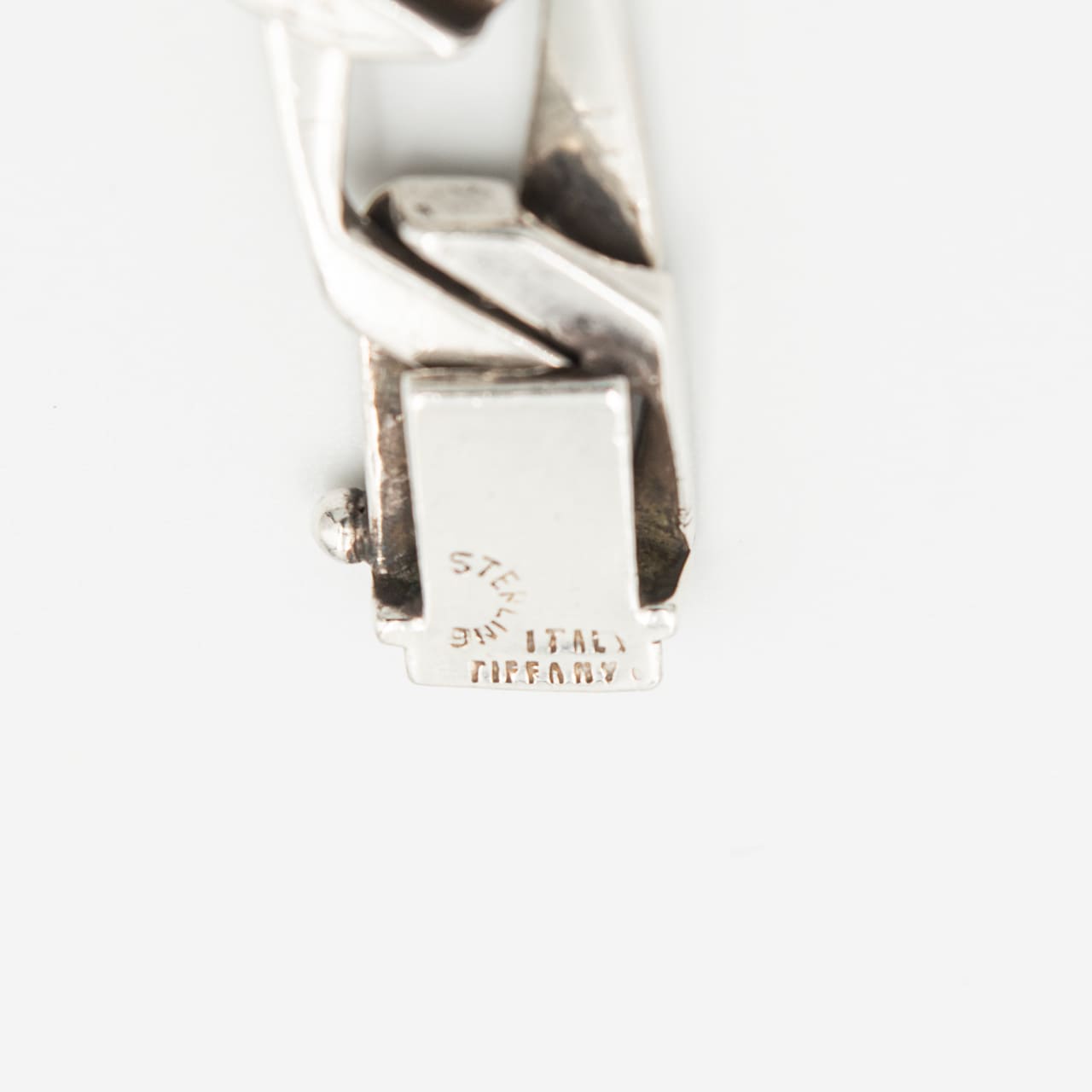 本品のクラスプ裏には、円形に配した「STERLING」表記が確認できます。流通数は多くありませんが、1970年代のティファニーの一部アイテムに見られる刻印様式で、時代特有のディテールとしてコレクターに評価されています。あわせて「ITALY」「TIFFANY」の刻印が入り、当時ティファニーがシルバージュエリーの国外(イタリア・スペイン等)製造委託を本格化させていた時期の文脈とも合致します。