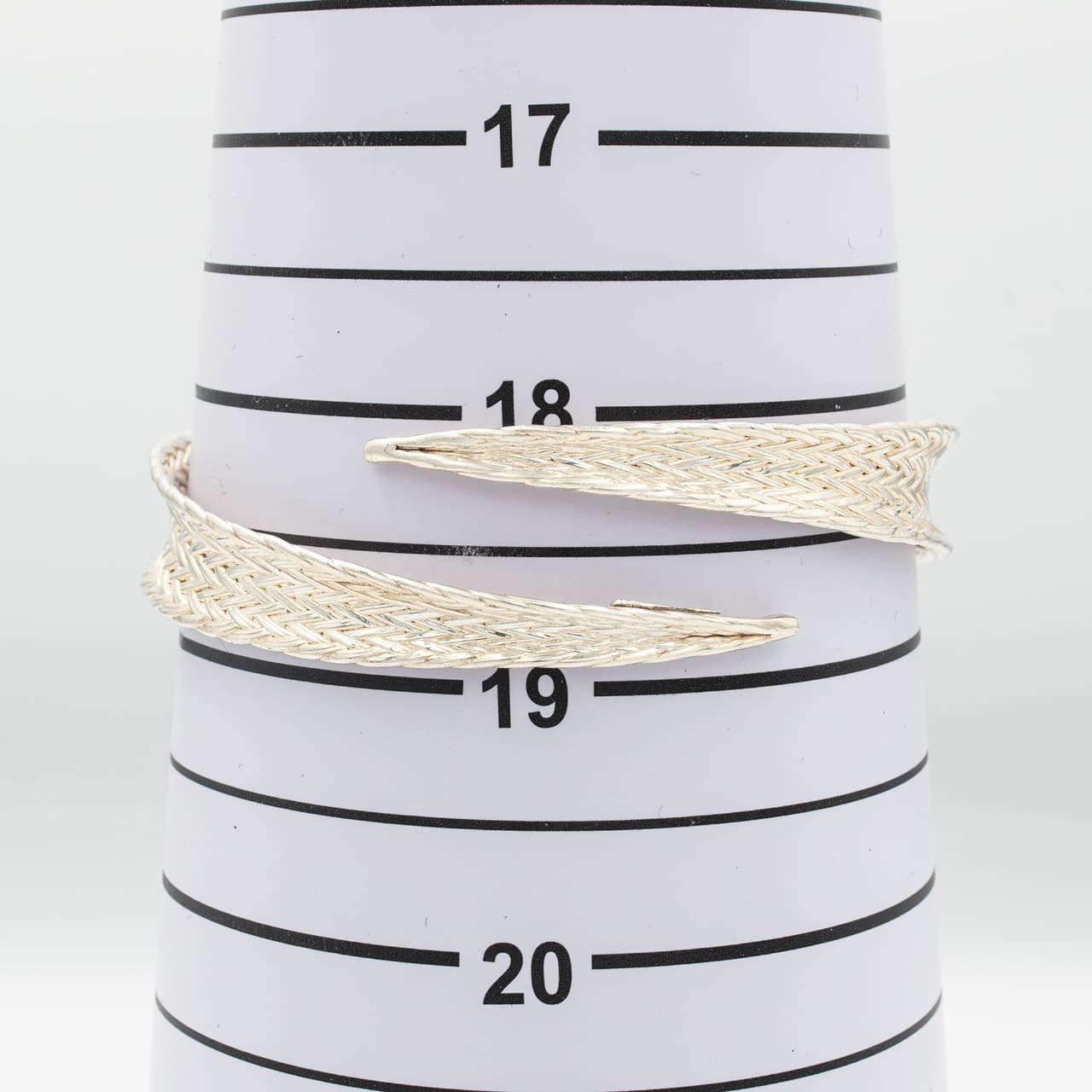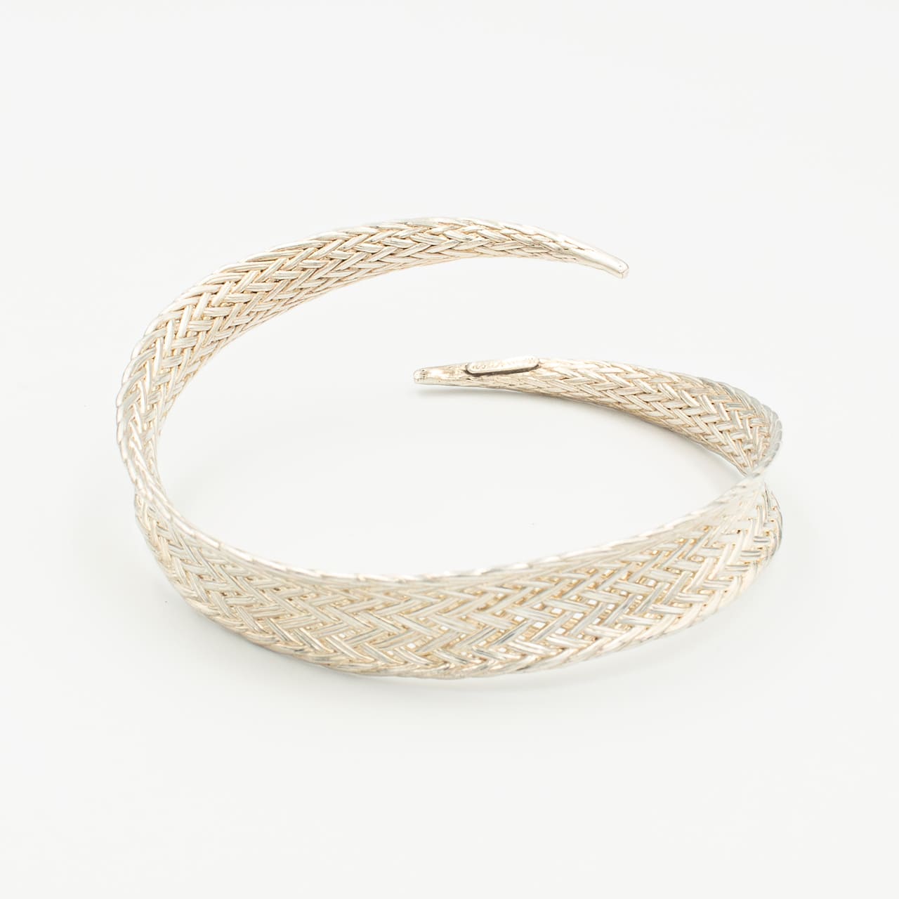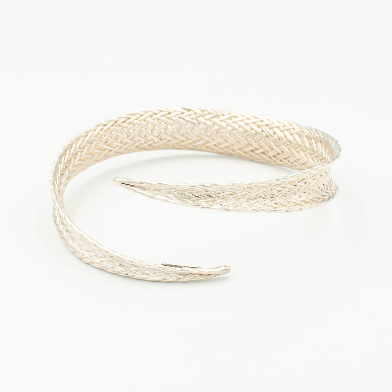 自然の葉を幾何学に抽象化した、ウーブンリーフコレクションのブレスレットです。織物のように細かなテクスチャが面に陰影を生み、手首の動きに合わせて上品な輝きを返します。ミニマルでありながら、知的な存在感を添える一本です。