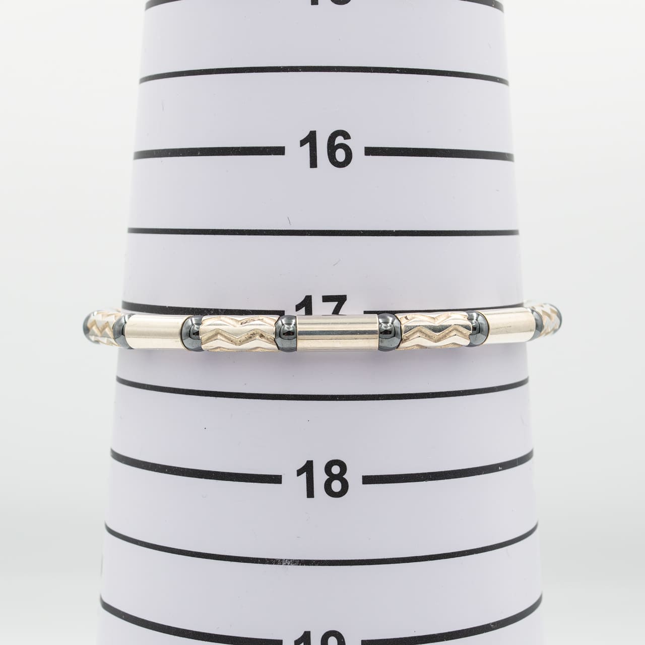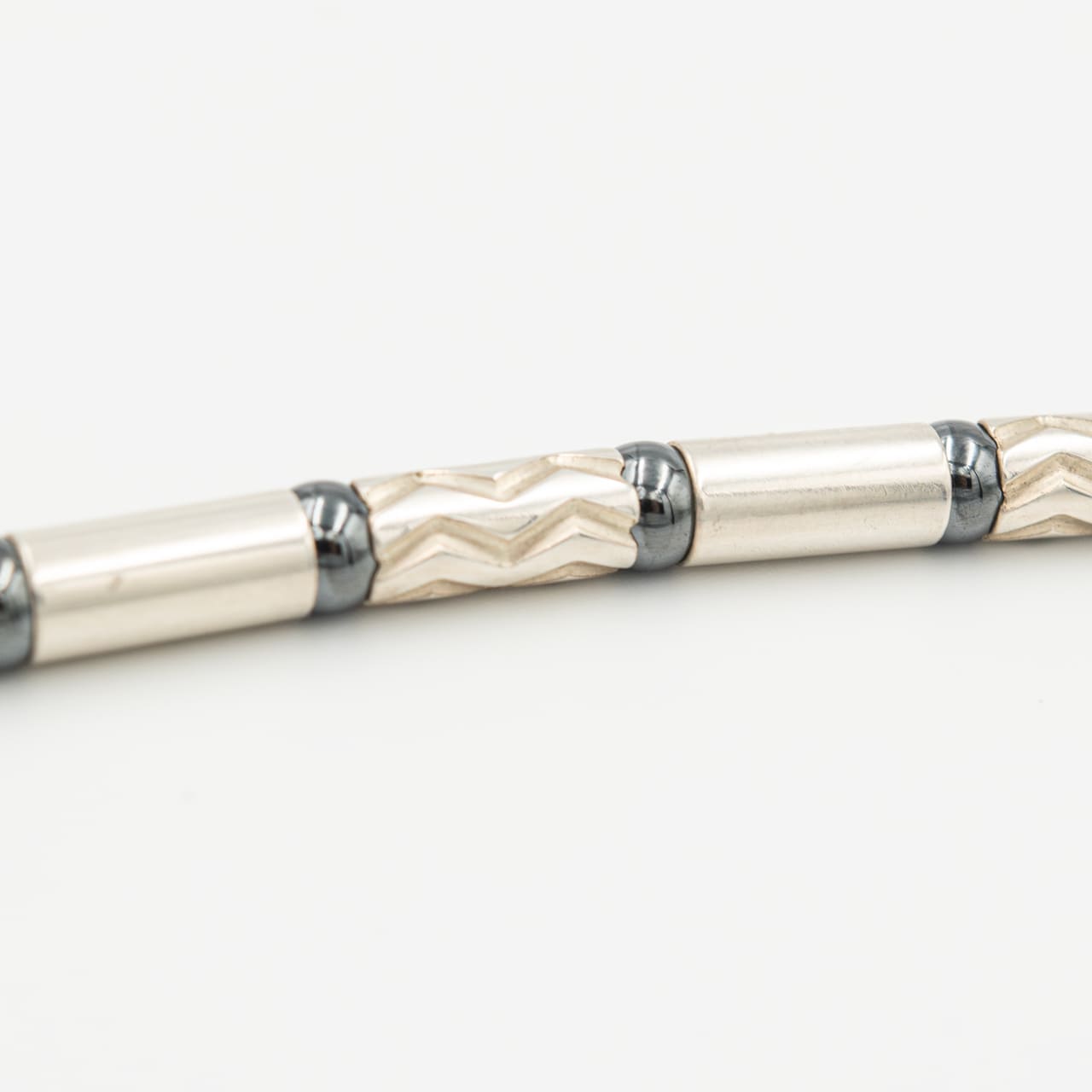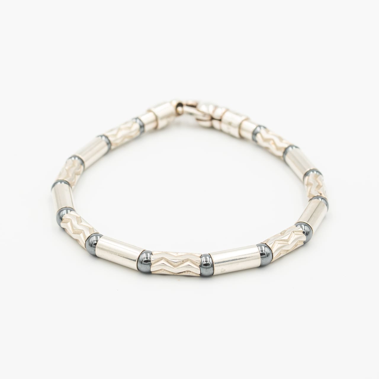 深く刻まれたジグザグ(稲妻状)のエッチングと、シルバーとヘマタイトのビーズが織りなすリズムが特徴のブレスレットです。