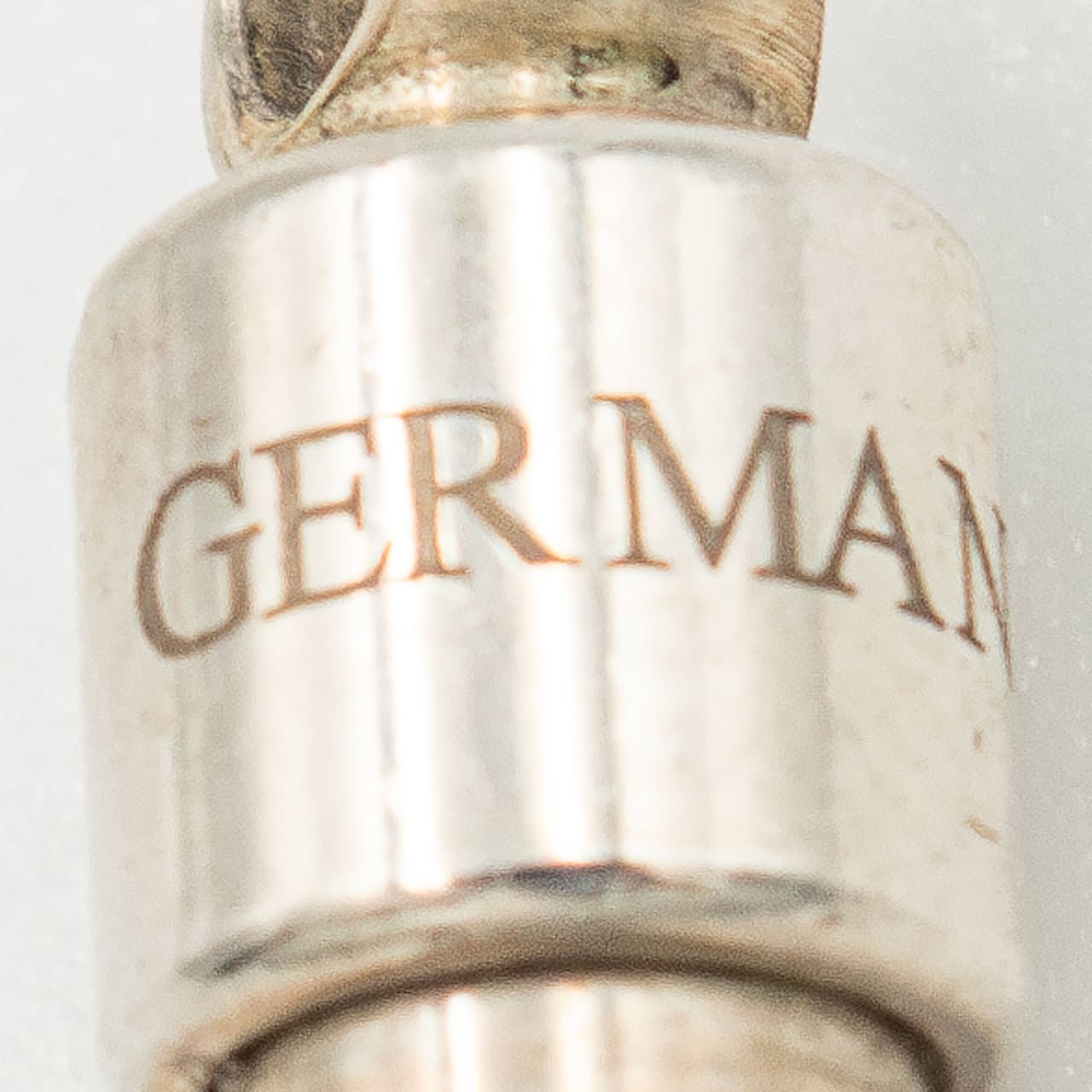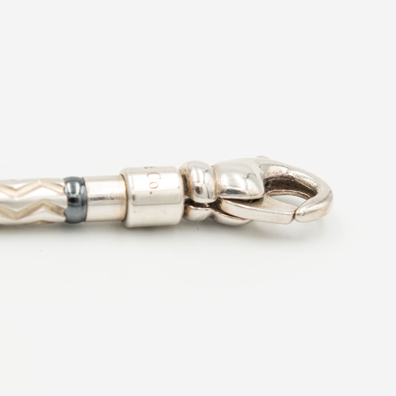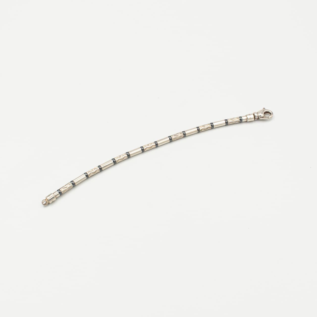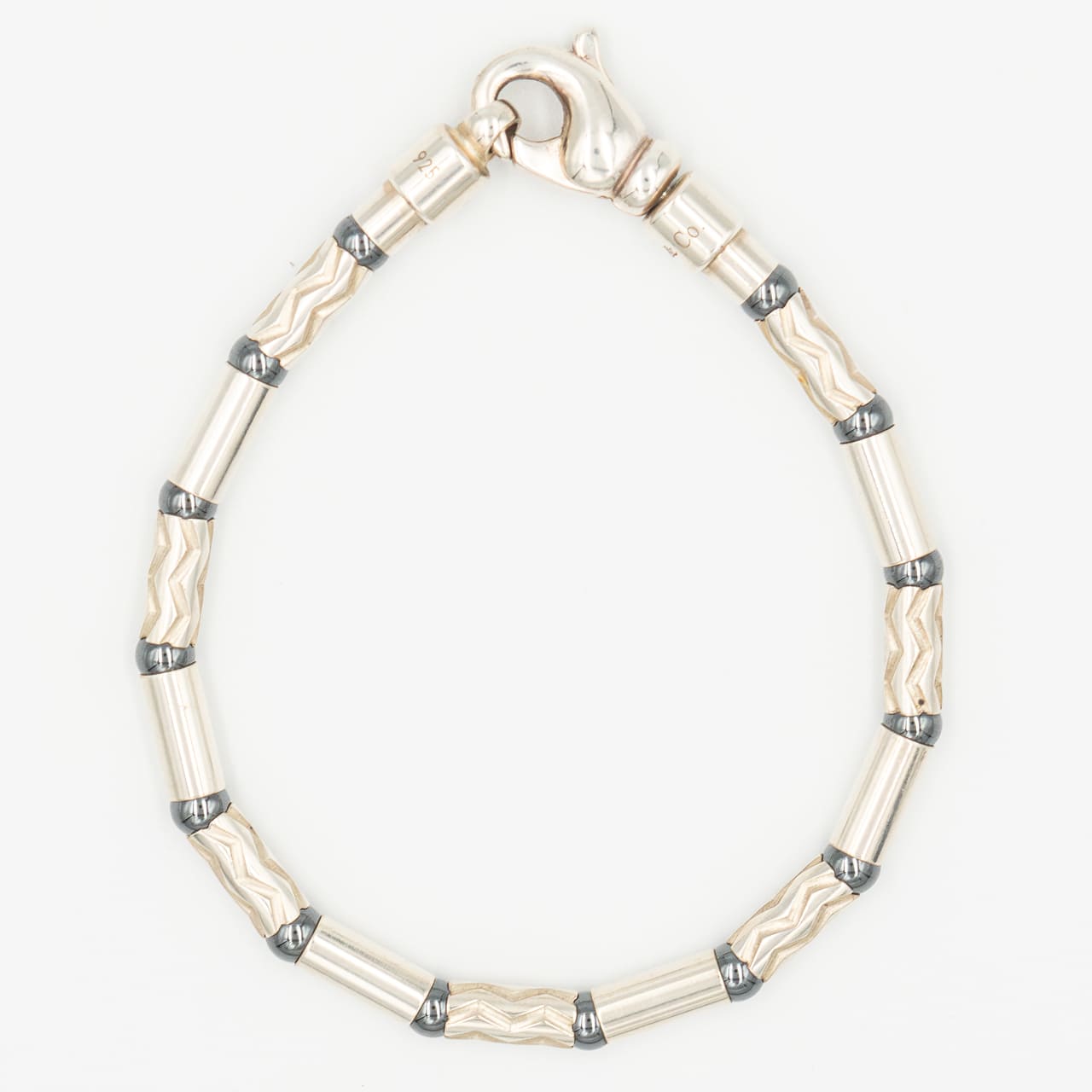 深く刻まれたジグザグ(稲妻状)のエッチングと、シルバーとヘマタイトのビーズが織りなすリズムが特徴のブレスレットです。