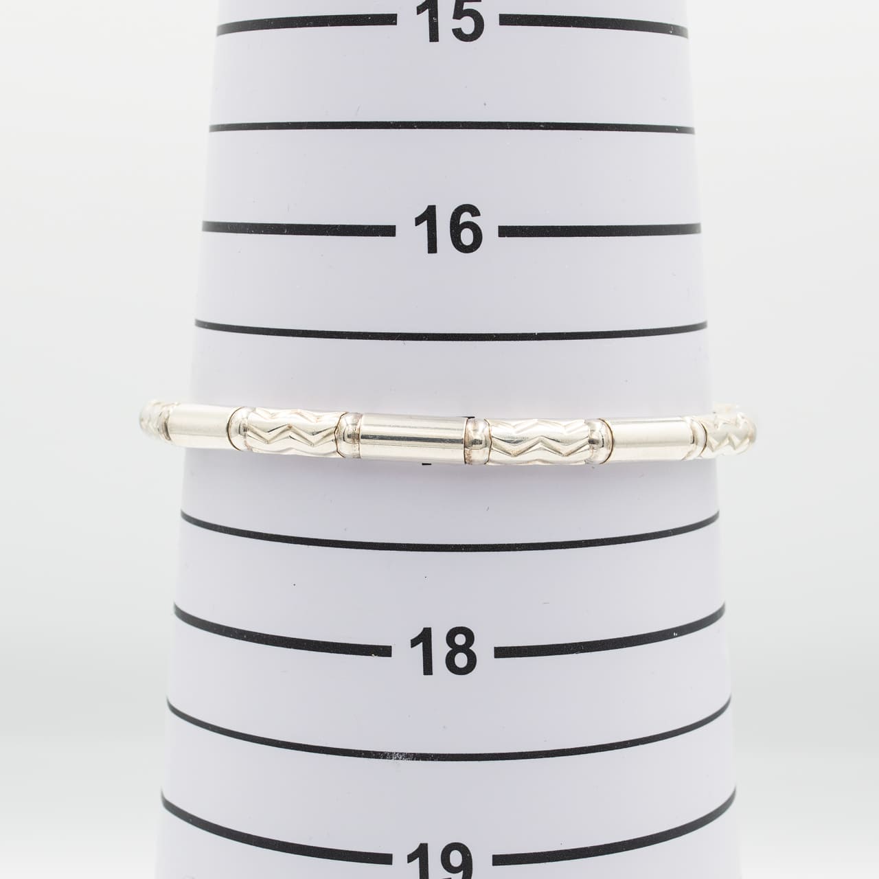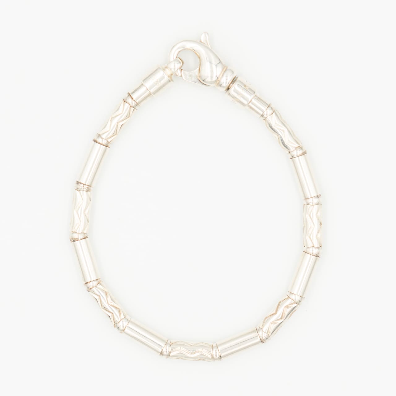 深く刻まれたジグザグ(稲妻状)のエッチングと、シルバーのビーズが織りなすリズムが特徴のブレスレットです。