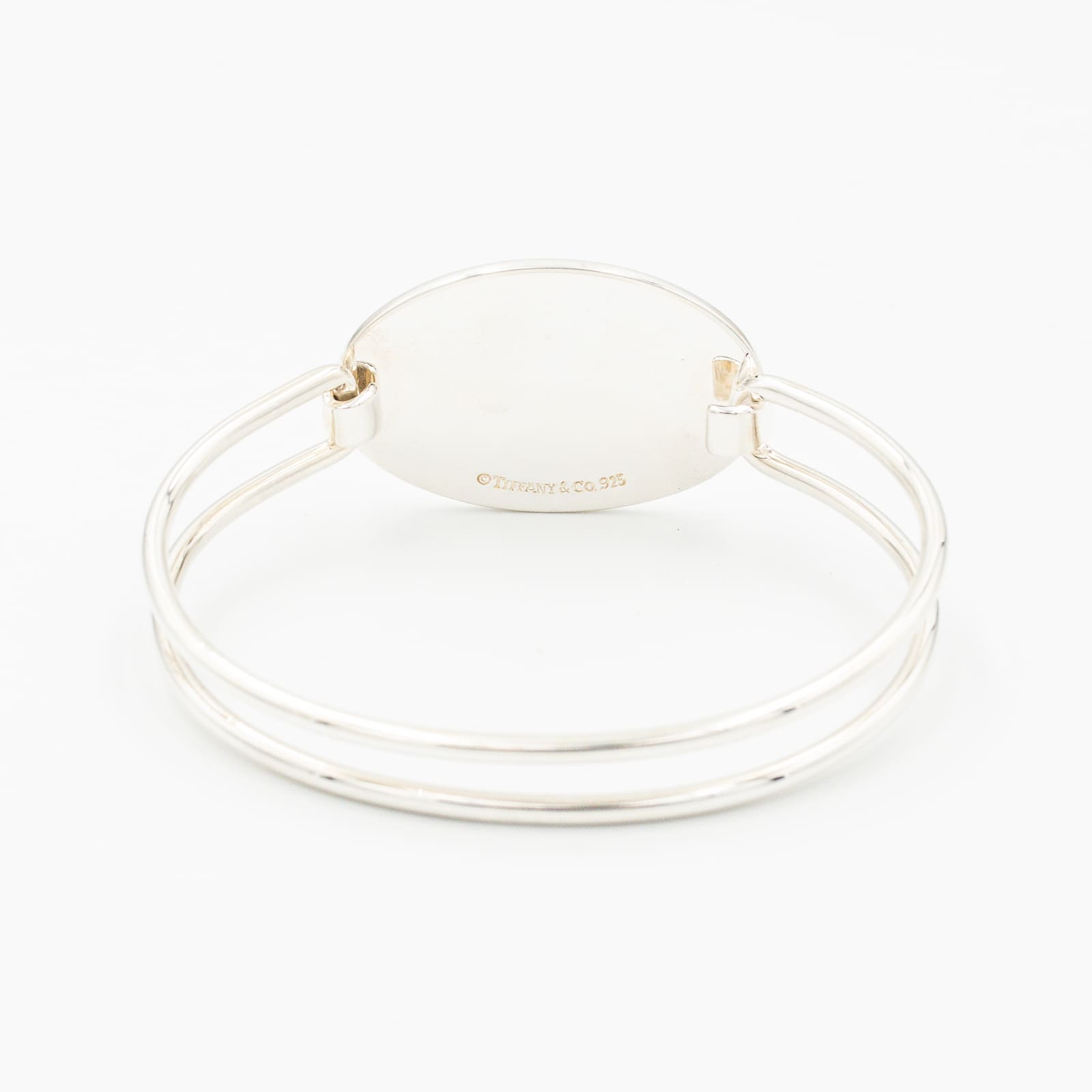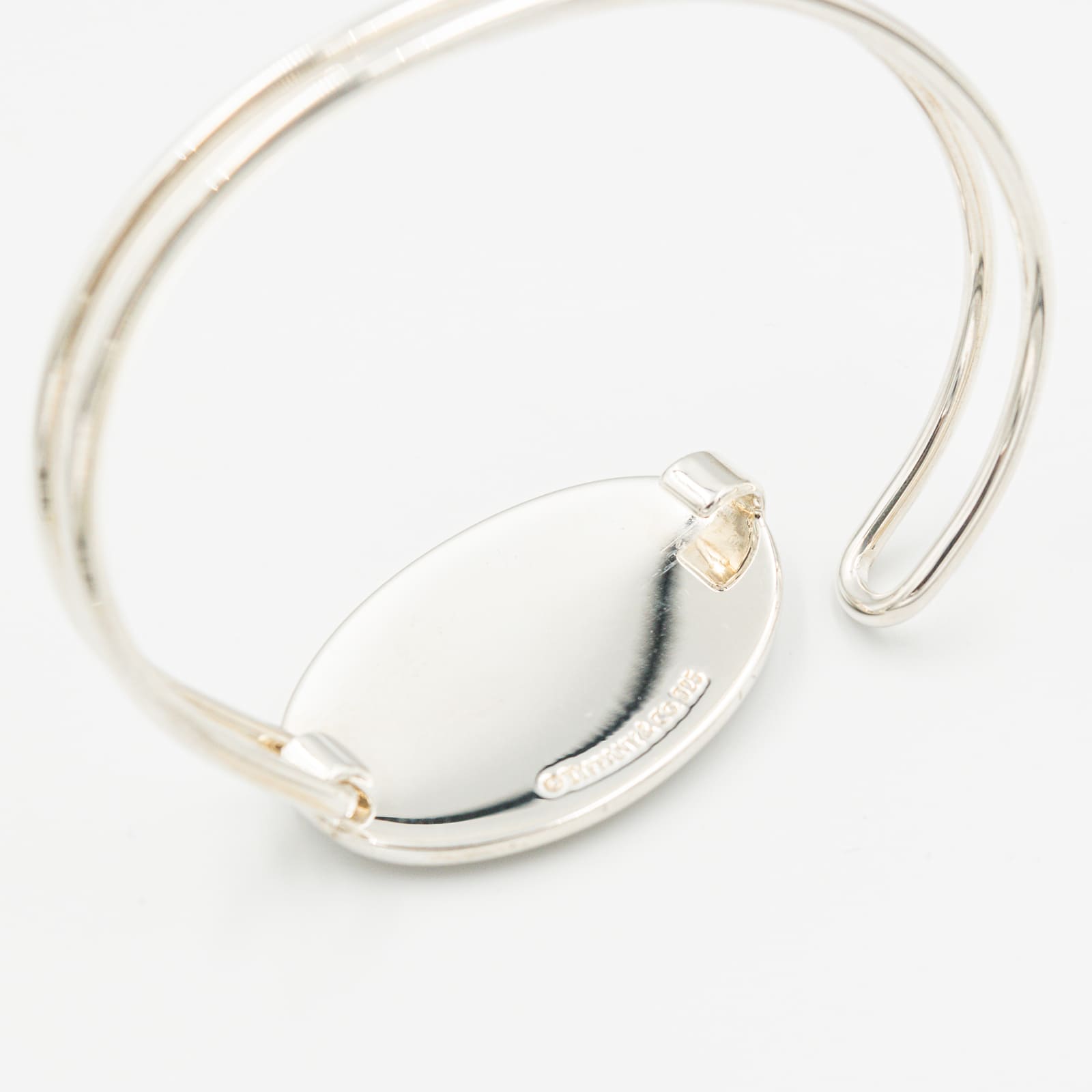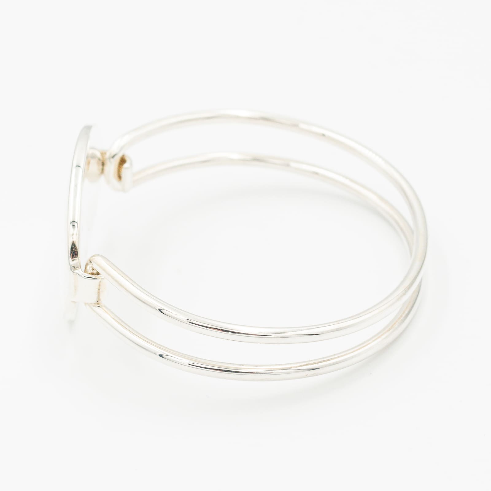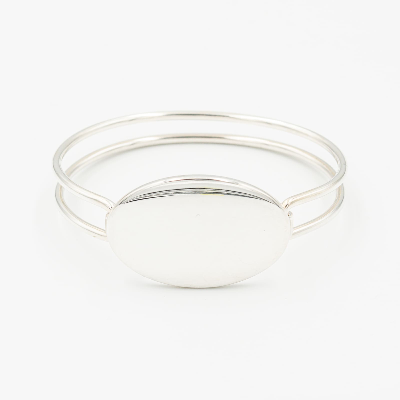 手首のラインに沿うオーバルシェイプのバングルに、フラットなプレートを配したミニマルな一本。