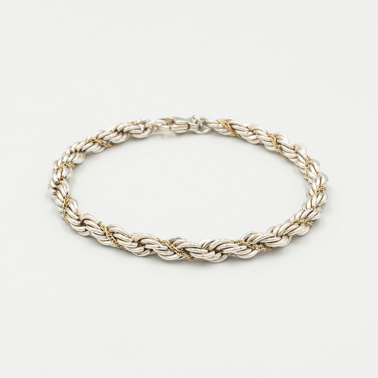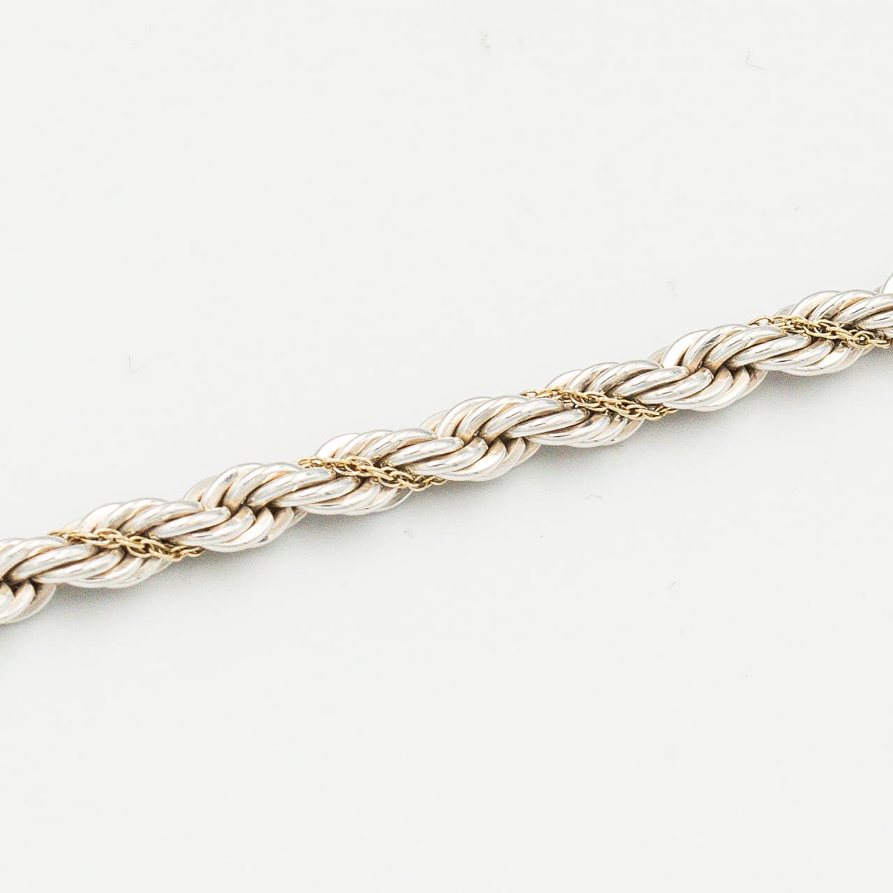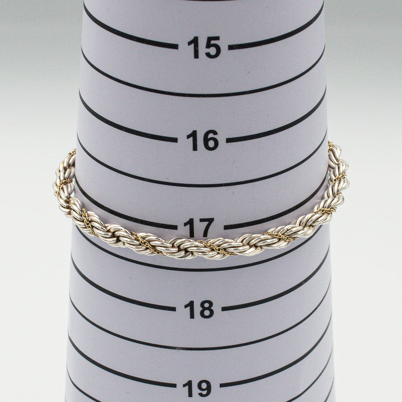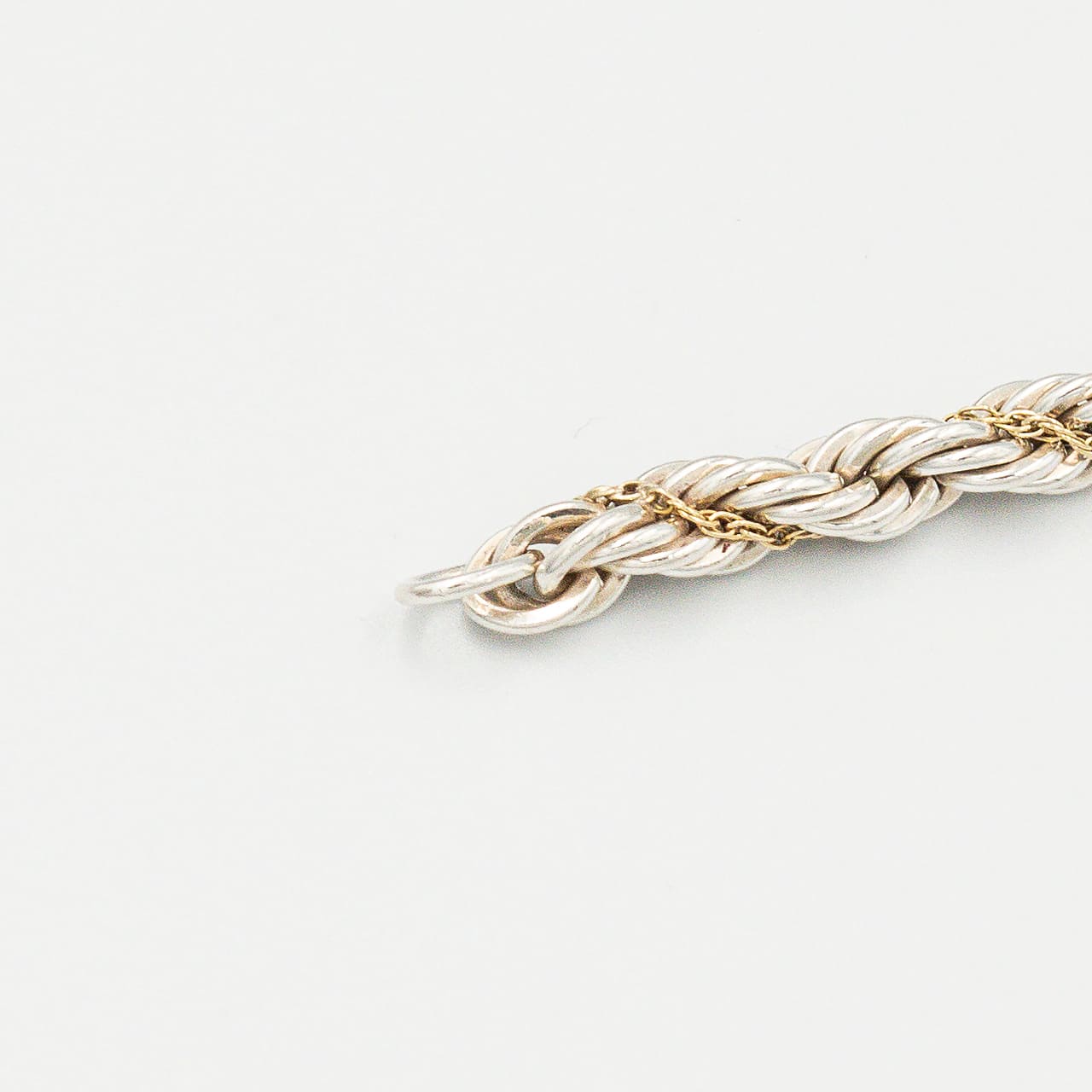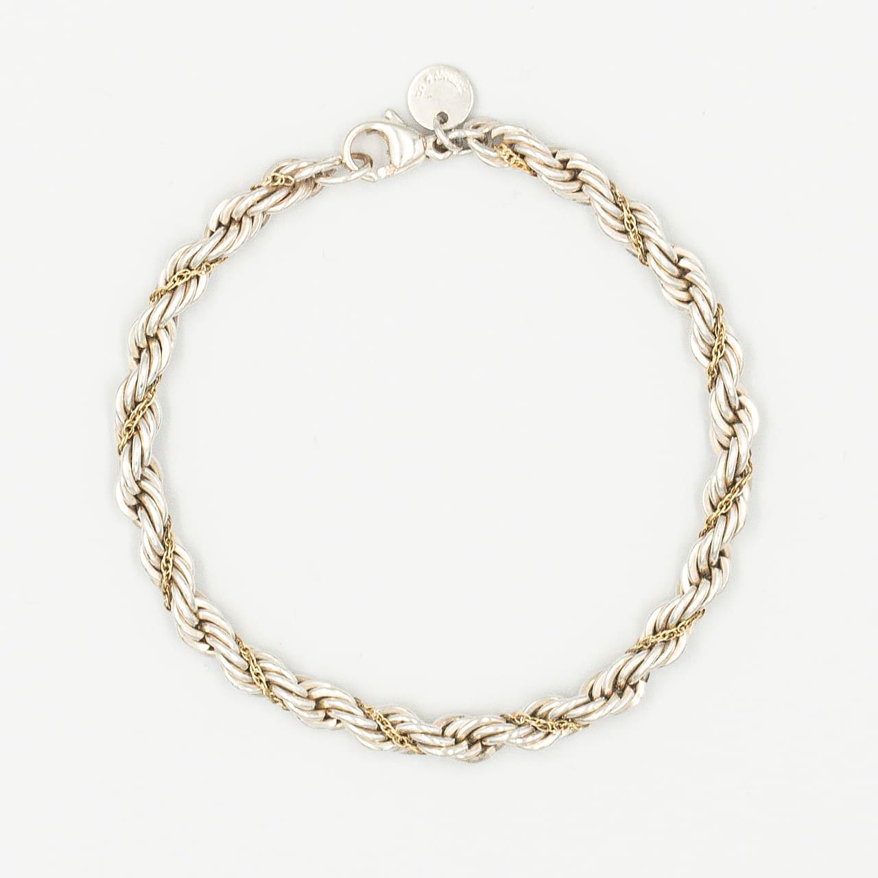 スターリングシルバーのロープチェーンに、ゴールドの細鎖を螺旋状に巻き付けた二重構成が特徴で、金属の光沢と縄目の陰影が手首の動きに合わせて立体的にきらめきます。
