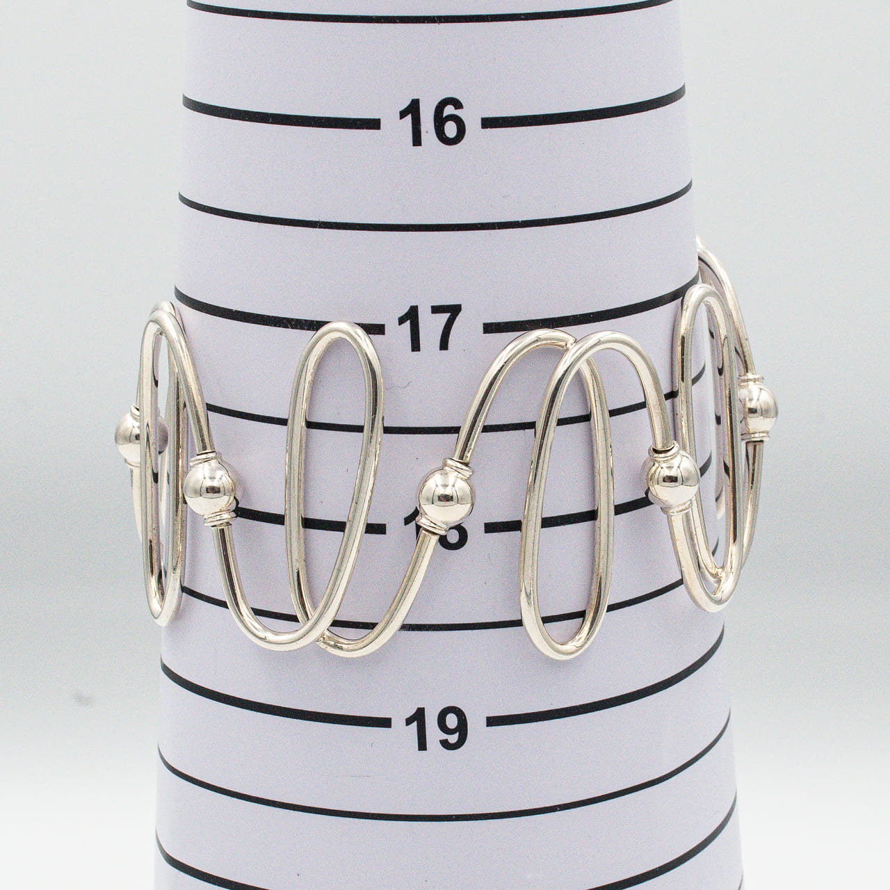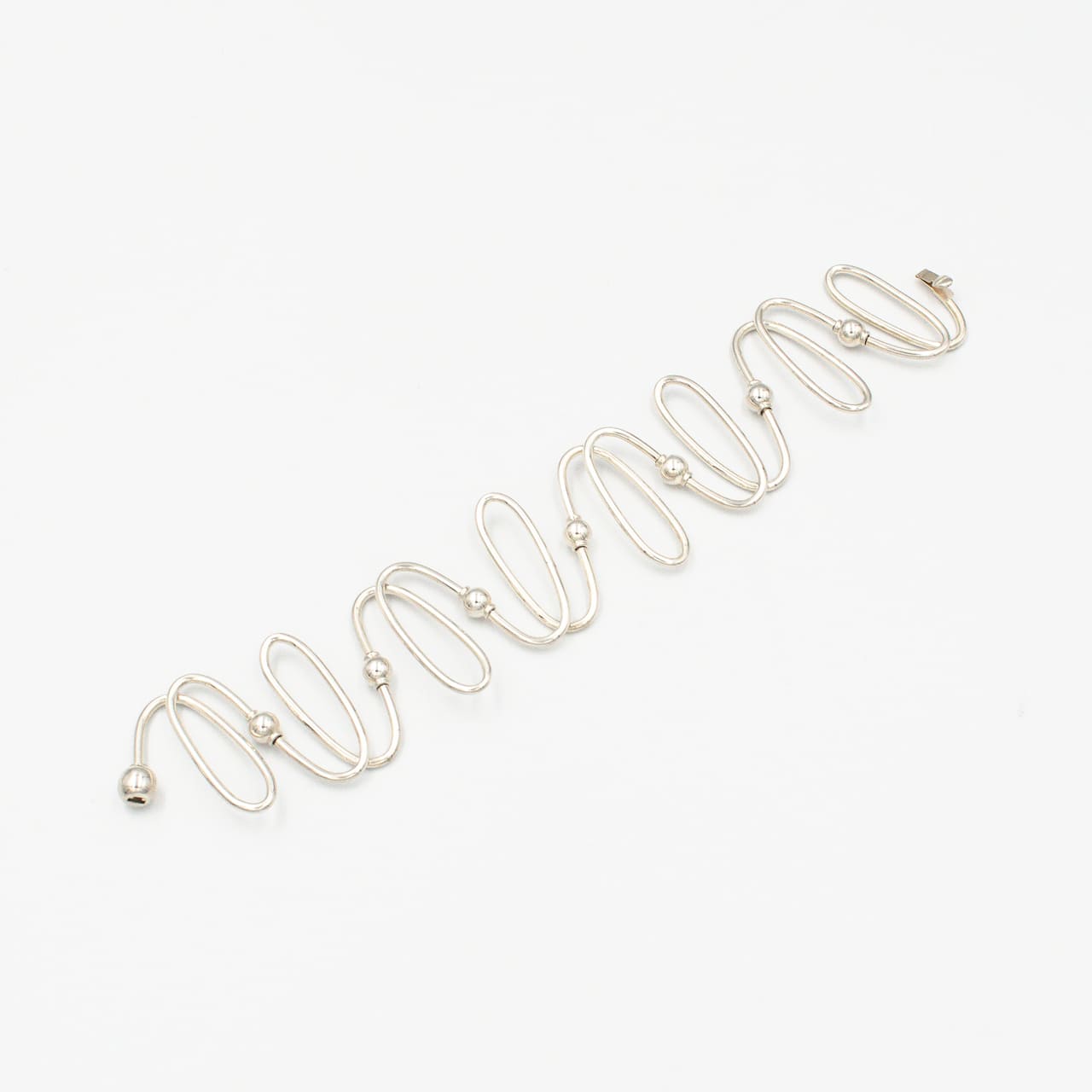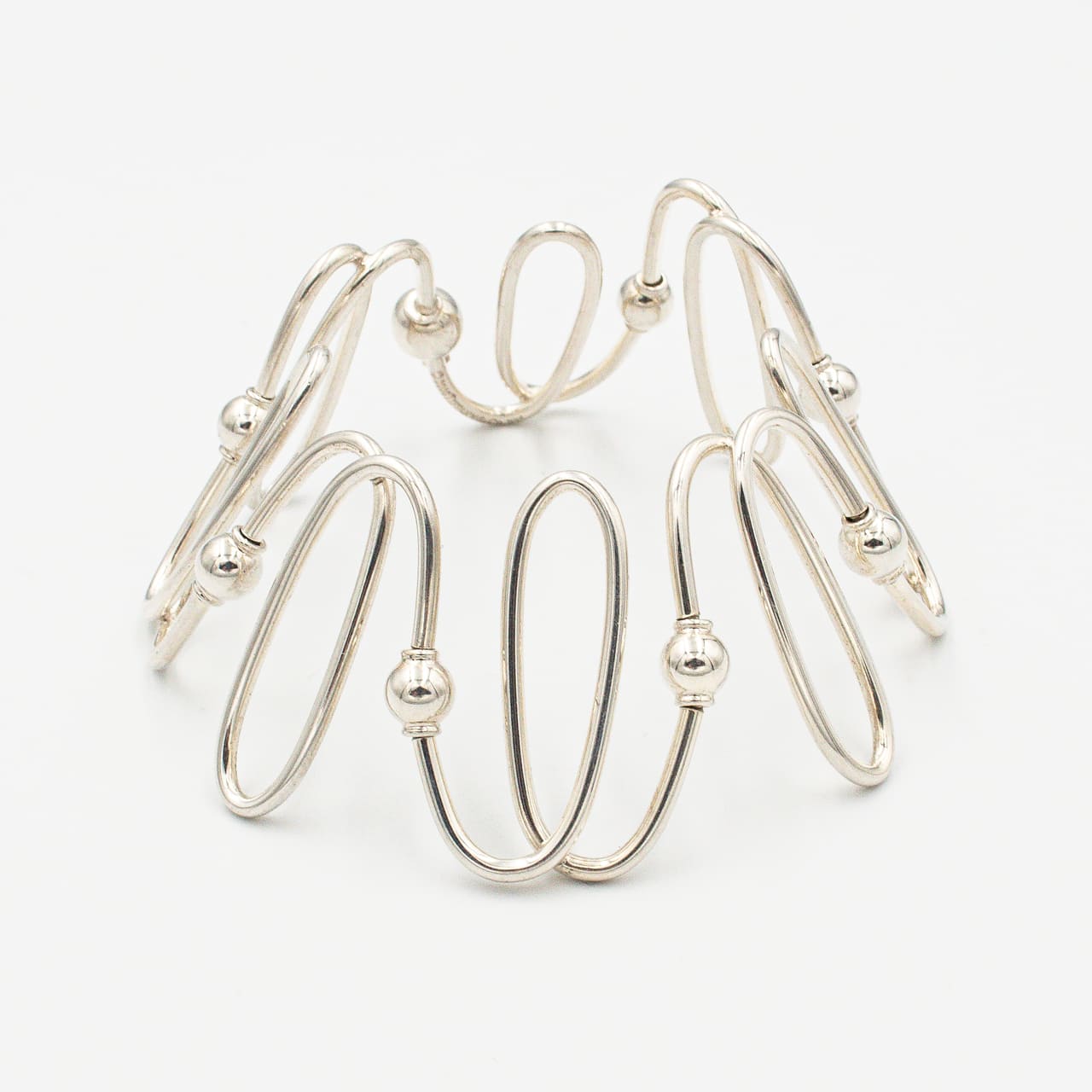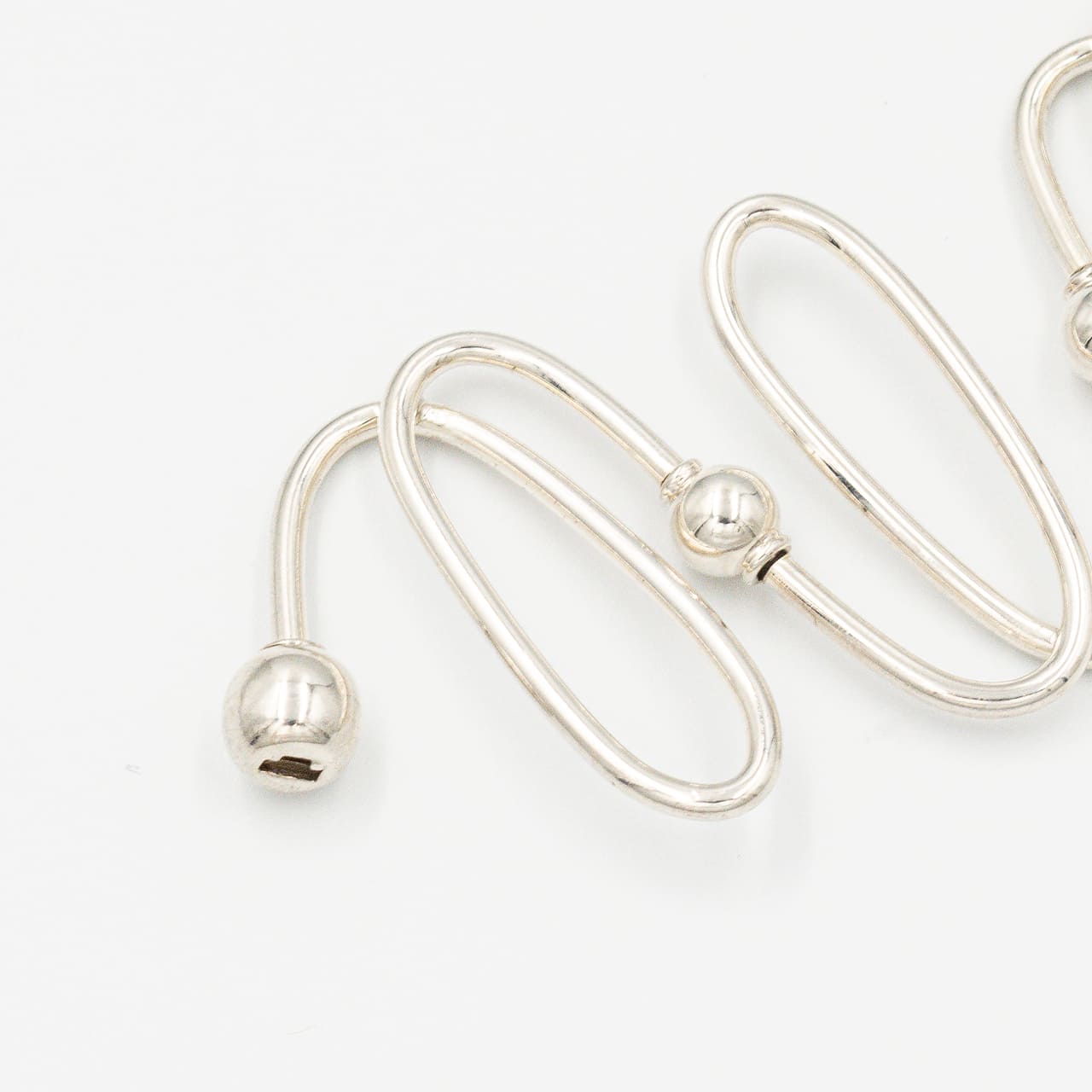 一本のワイヤーを螺旋状に巻き上げたようなラインが手首に沿って立ち上がり、ミニマルなのに彫刻的な存在感を放つ一本。