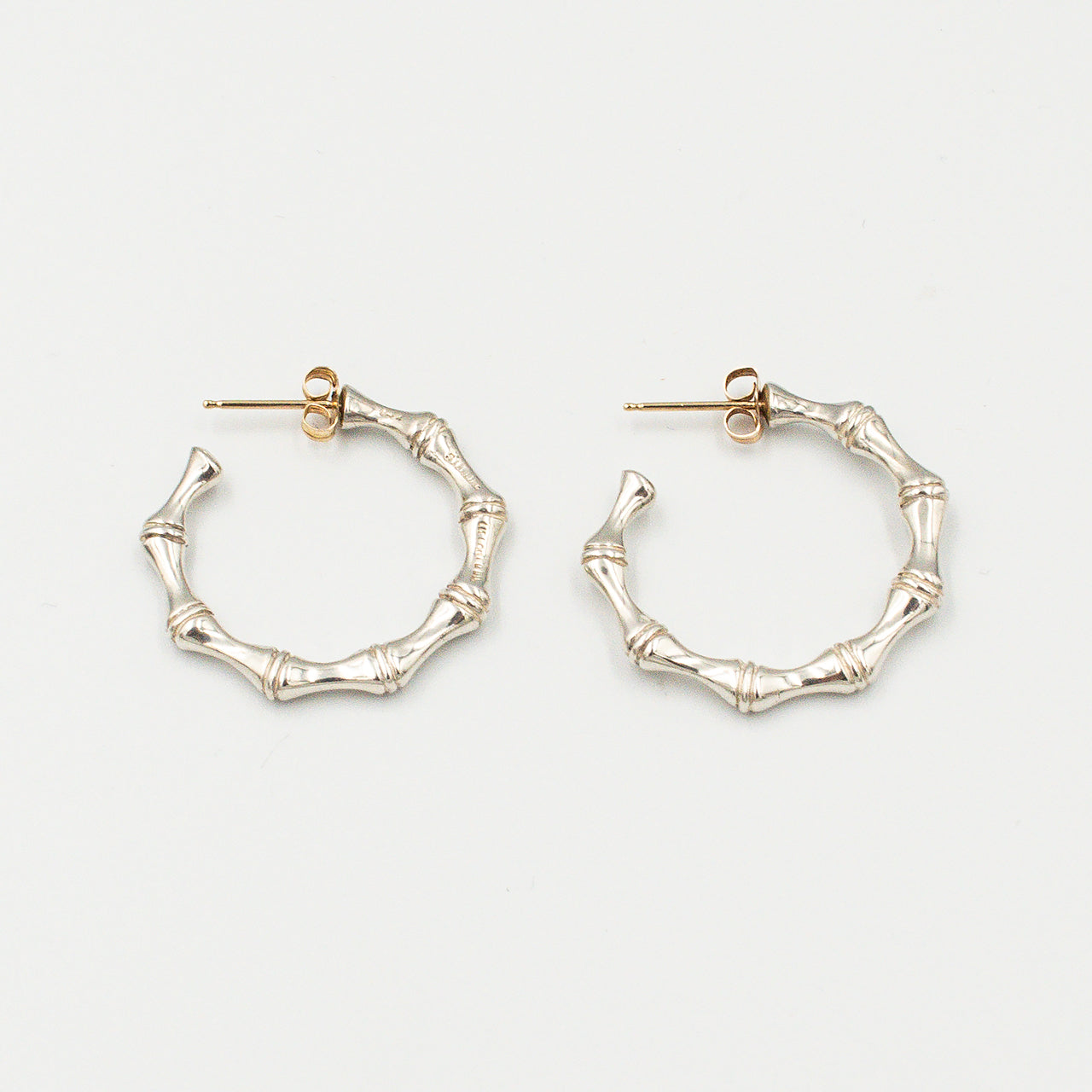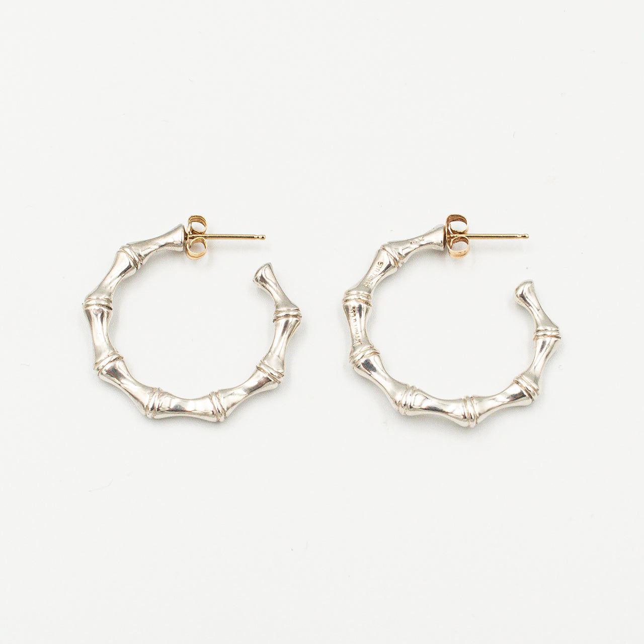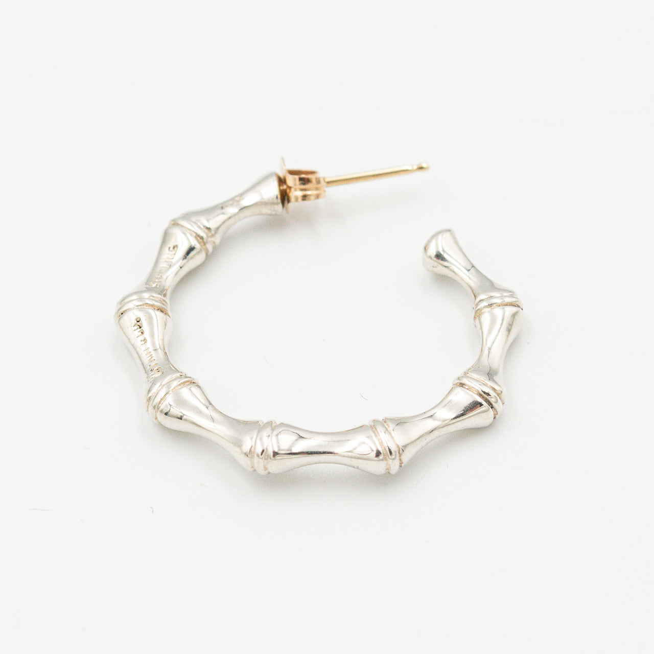 竹の節を写し取った立体的な稜線を、鏡面のスターリングシルバーで彫刻的に表現したピアス。