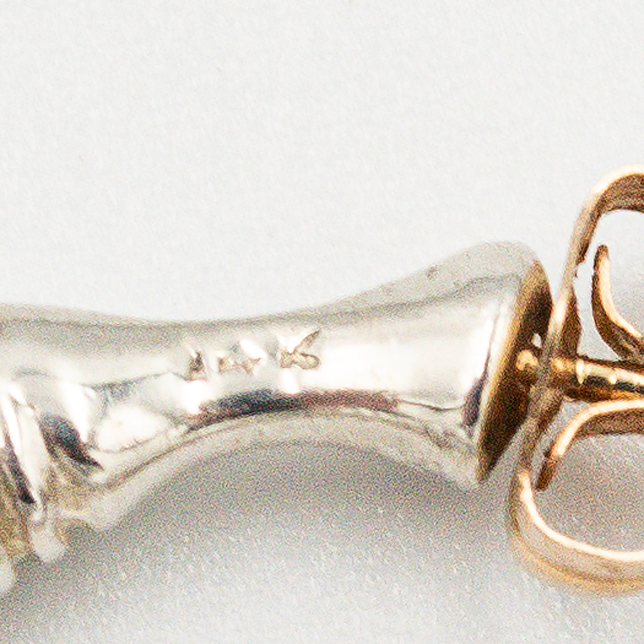 本体はシルバー、ポストとキャッチは14Kのコンビ仕様で、ボディにTIFFANY & CO. / STERLING / 14K、キャッチに14Kの刻印を確認できます。