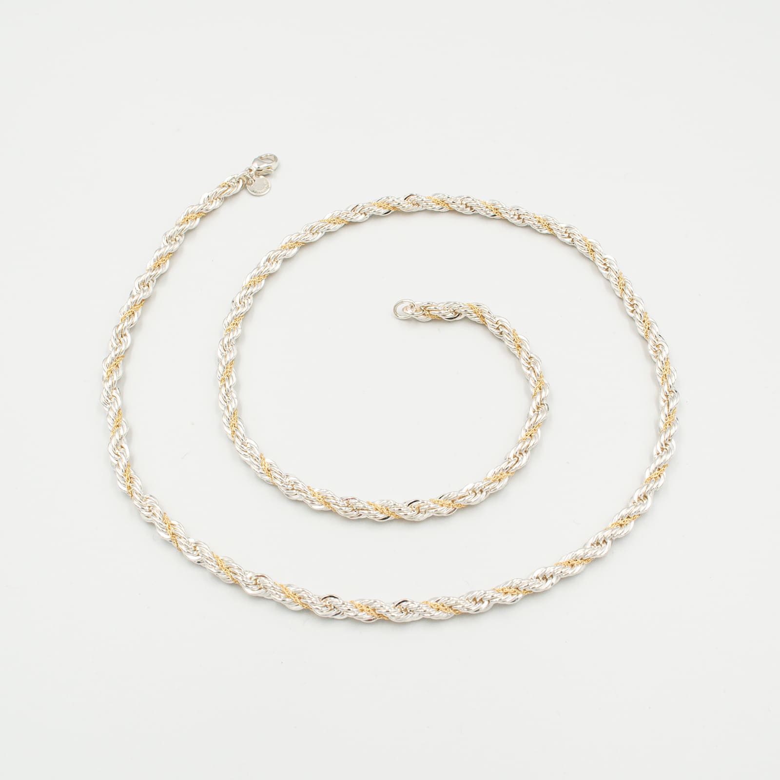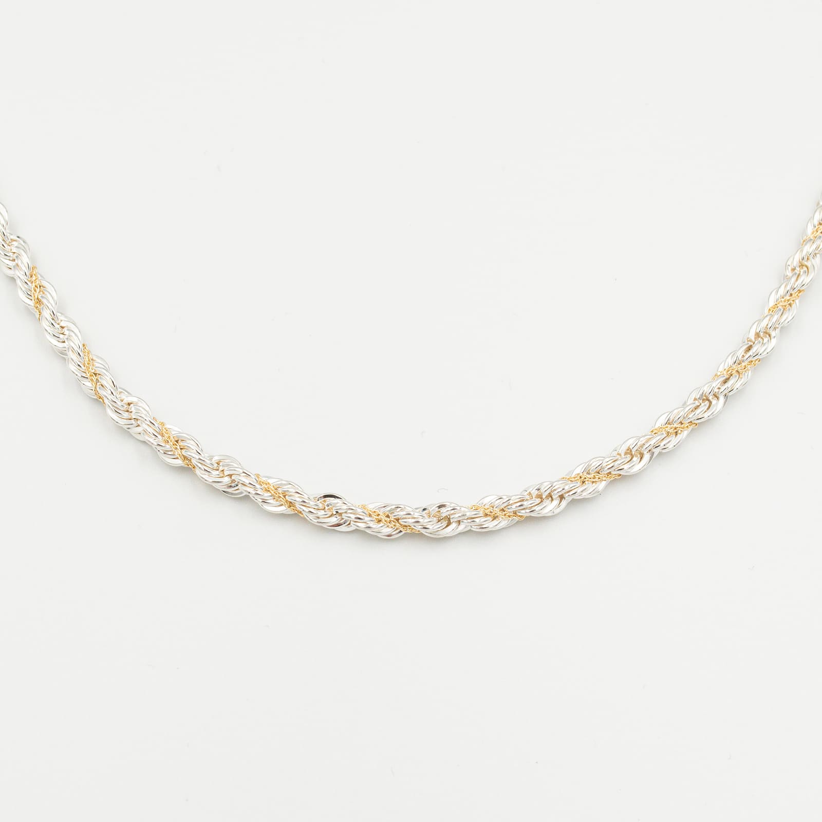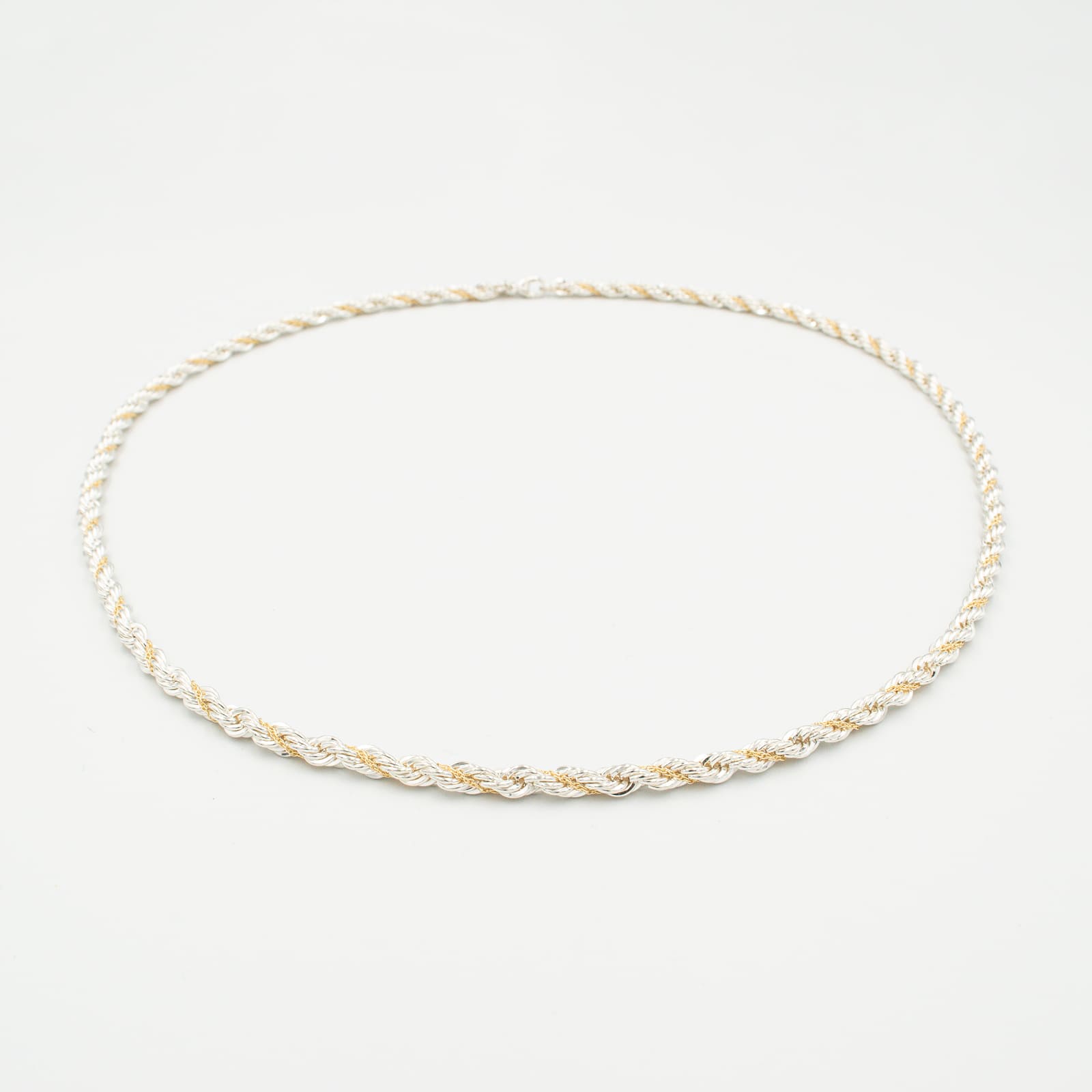 スターリングシルバーのロープチェーンに、ゴールドの細鎖を螺旋状に巻き付けた二重構成が特徴で、金属の光沢と縄目の陰影が動きに合わせて立体的にきらめきます。