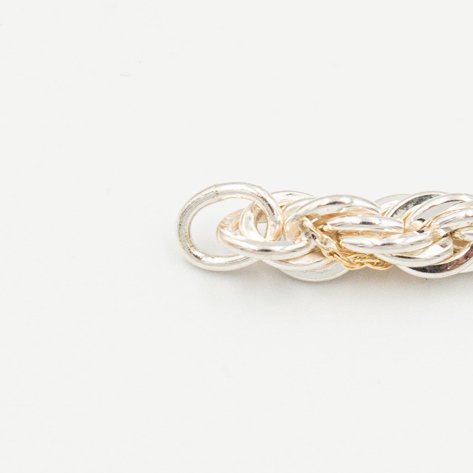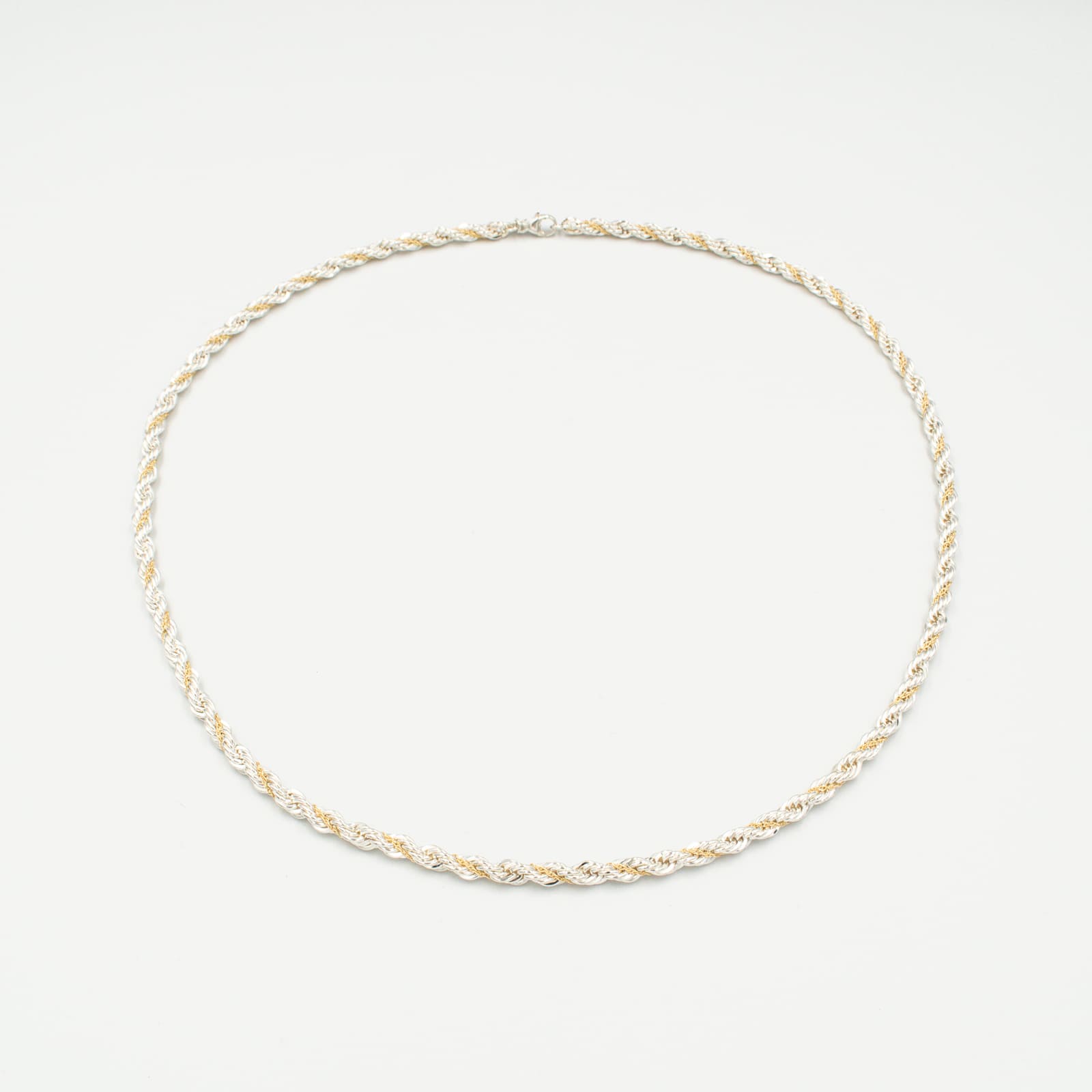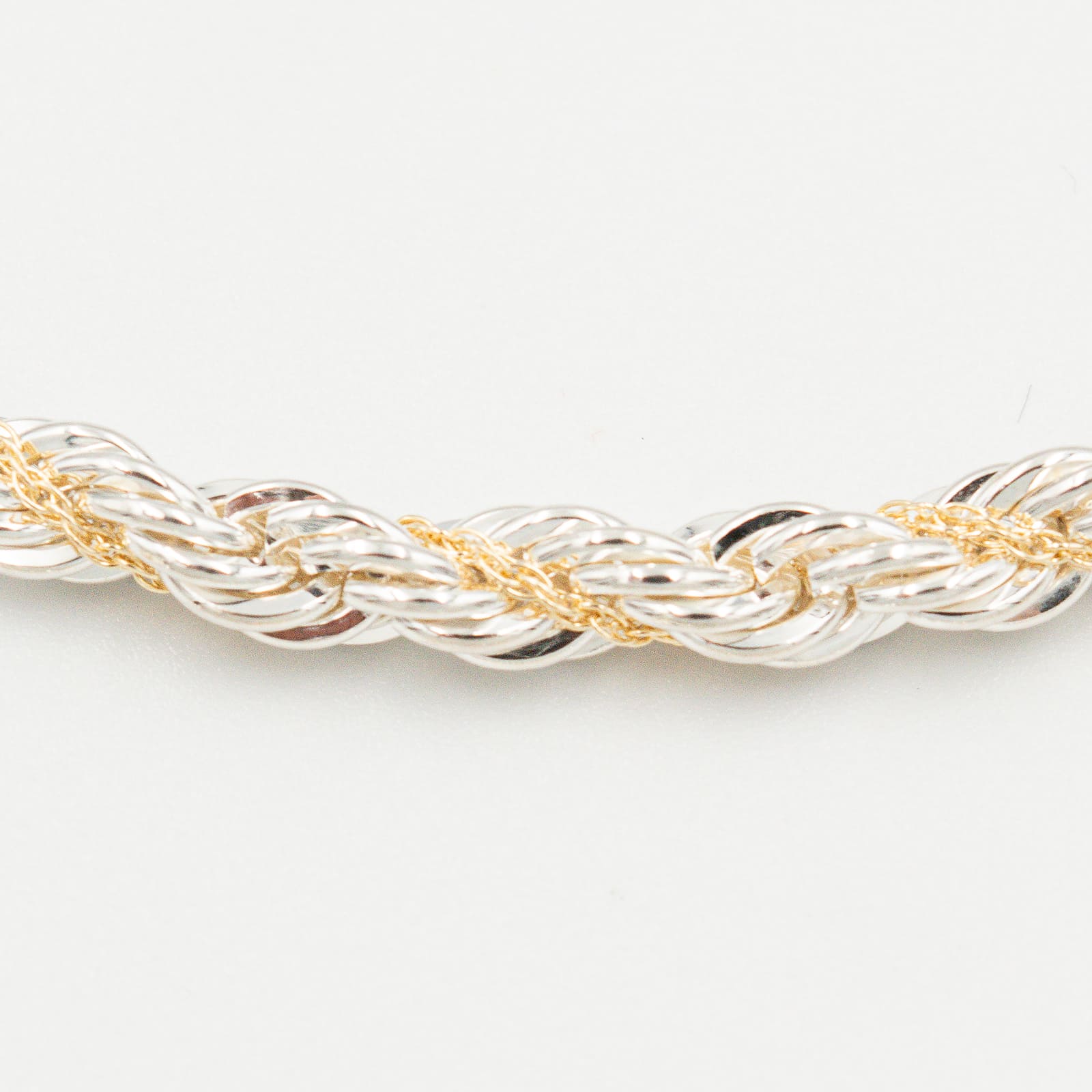 スターリングシルバーのロープチェーンに、ゴールドの細鎖を螺旋状に巻き付けた二重構成が特徴で、金属の光沢と縄目の陰影が動きに合わせて立体的にきらめきます。