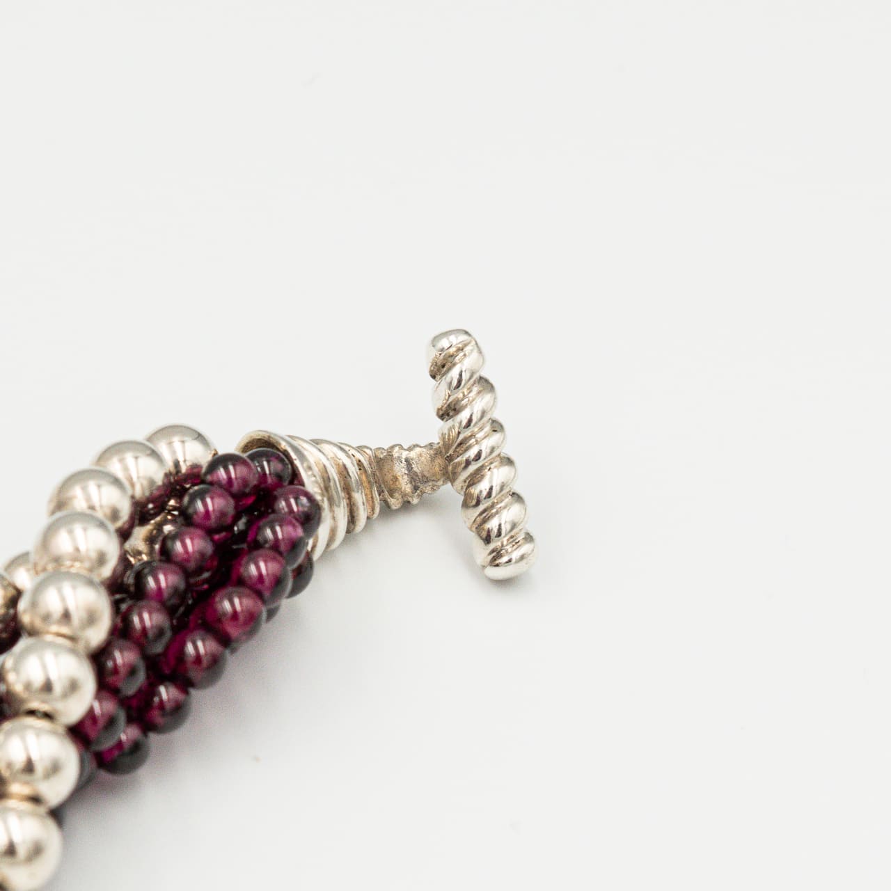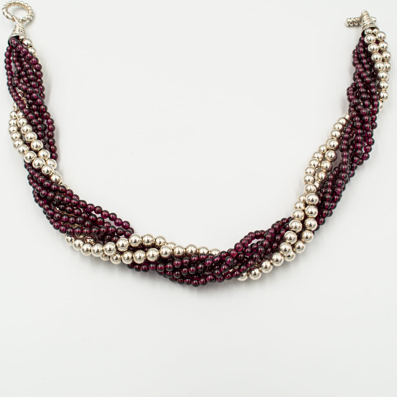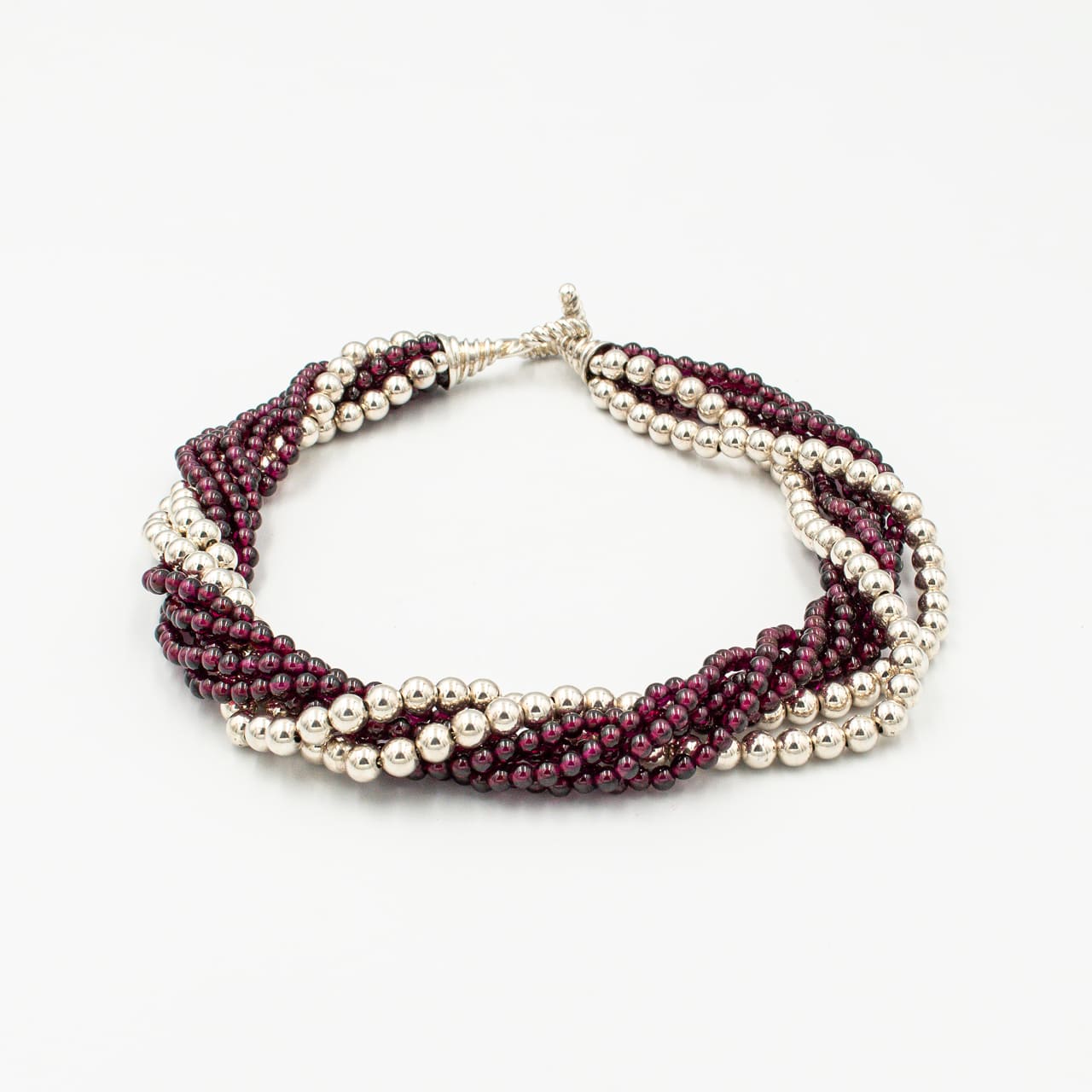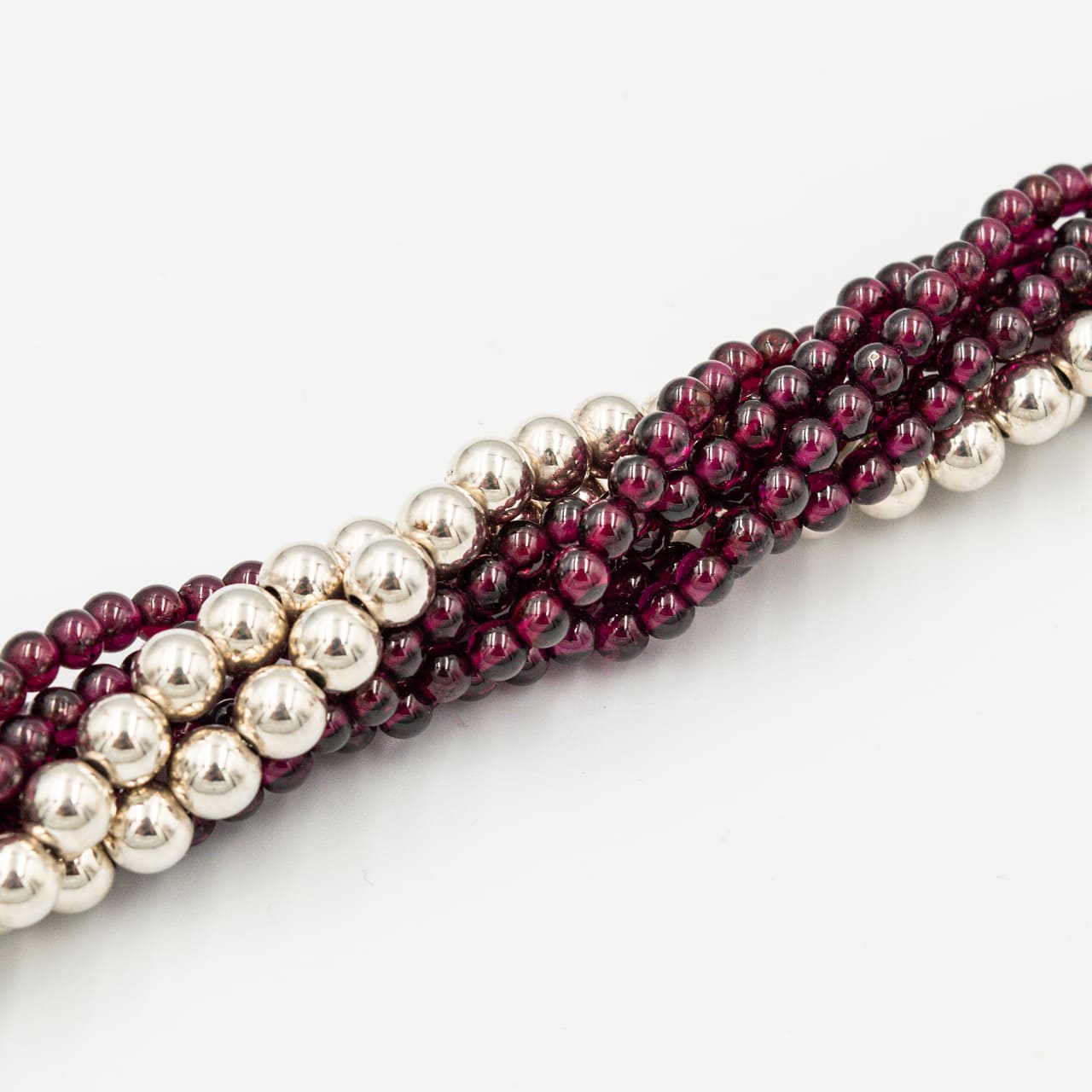 深いワインレッドのガーネットを粒径のそろった小粒ビーズで連ね、シルバービーズを間に配したネックレス。