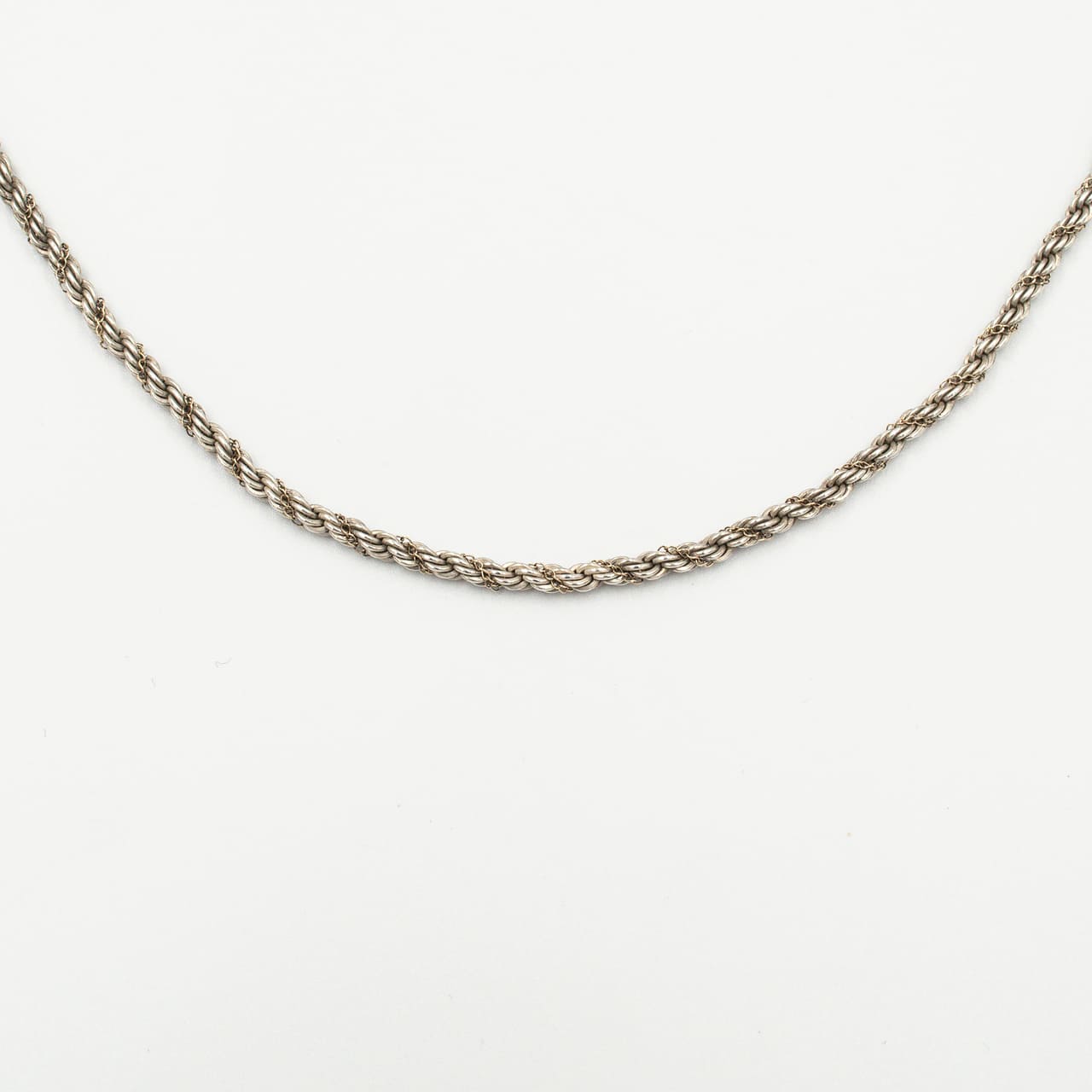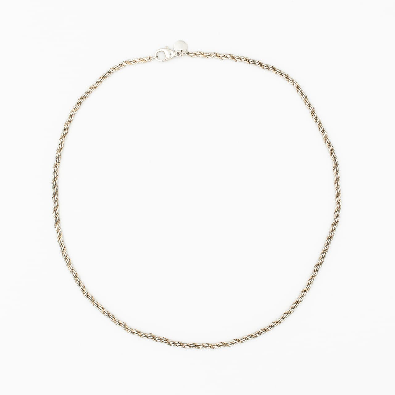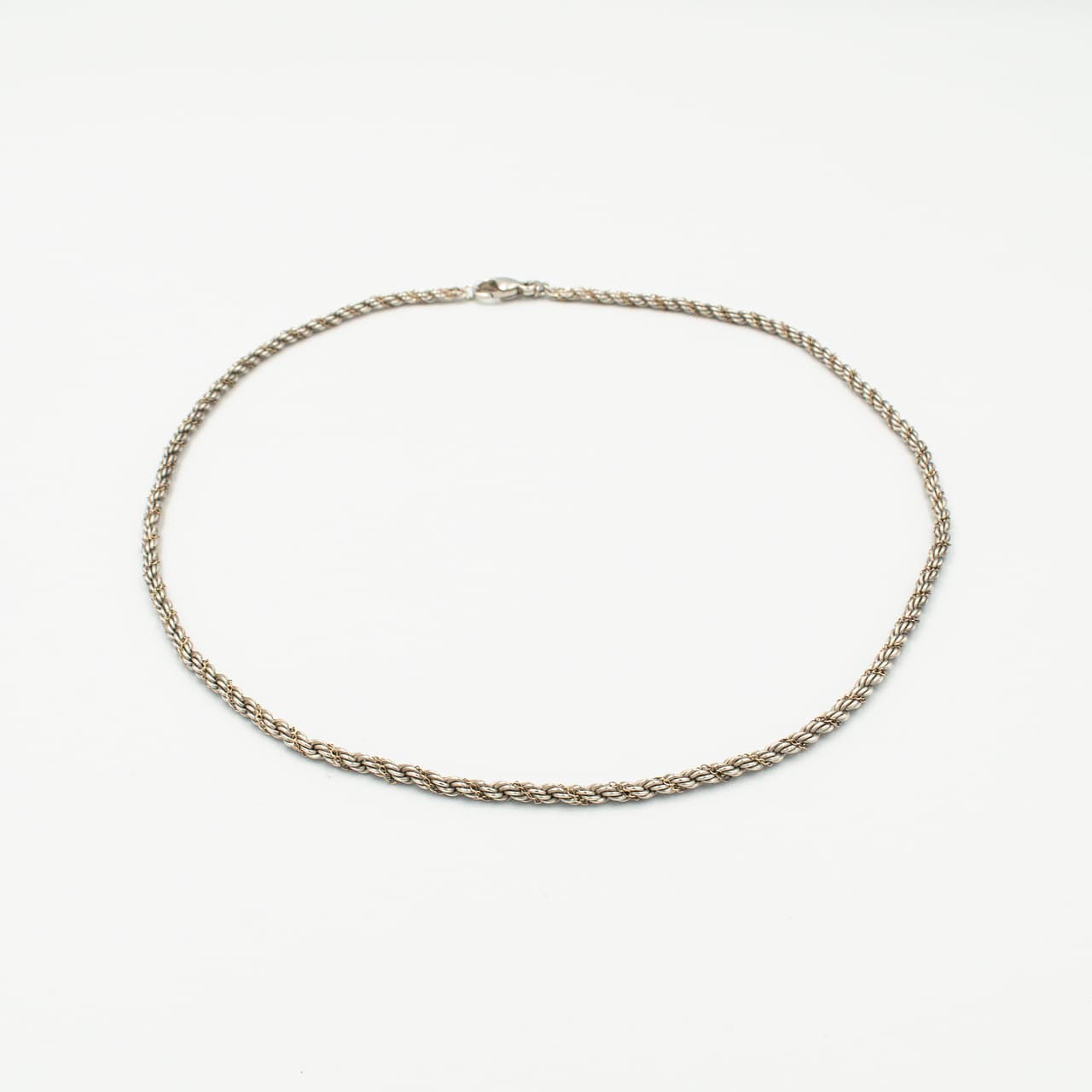 ティファニーの「シン(Thin)ツイストロープ ネックレス」は、1980年代前期から2000年ごろまで続いた人気シリーズの細幅タイプで、スターリングシルバーのロープチェーンに細いゴールドチェーンを螺旋状に巻き付けた構成が首元に繊細な陰影を与えます。