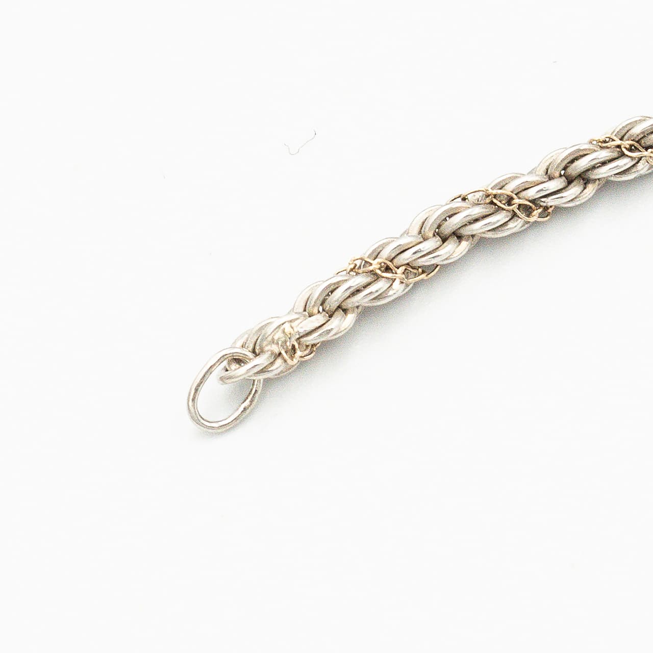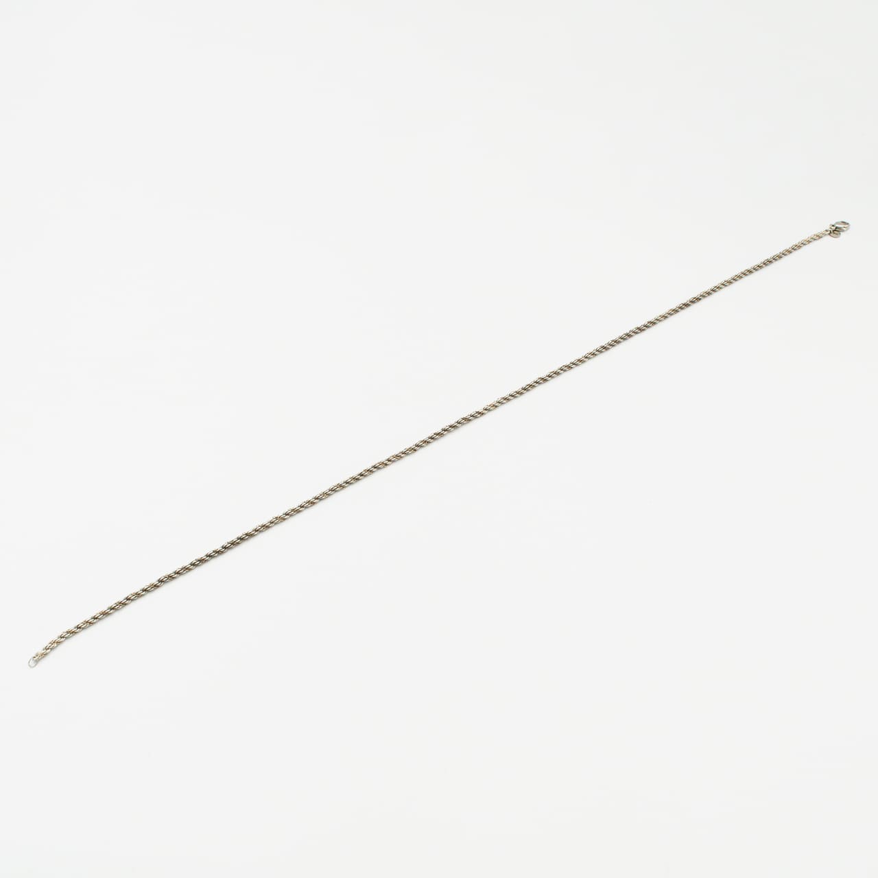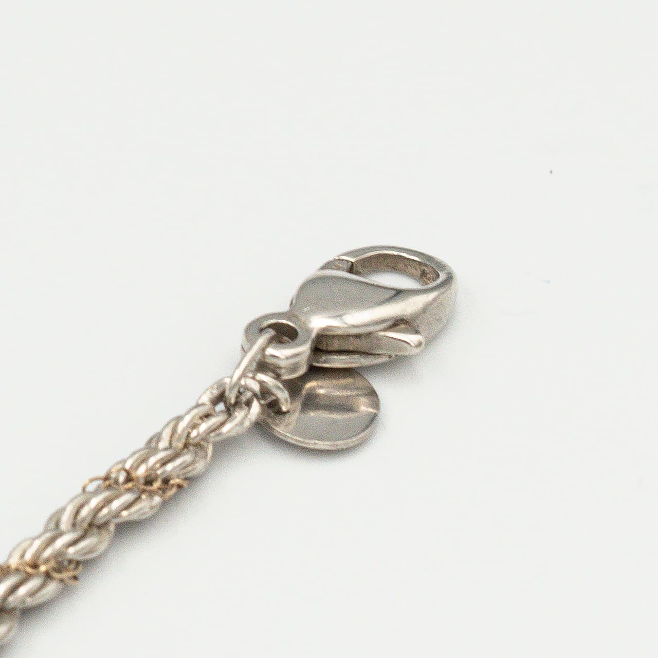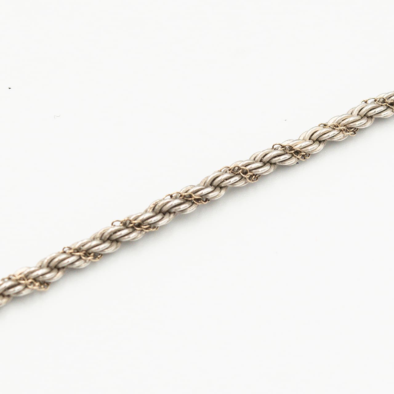 ティファニーの「シン(Thin)ツイストロープ ネックレス」は、1980年代前期から2000年ごろまで続いた人気シリーズの細幅タイプで、スターリングシルバーのロープチェーンに細いゴールドチェーンを螺旋状に巻き付けた構成が首元に繊細な陰影を与えます。