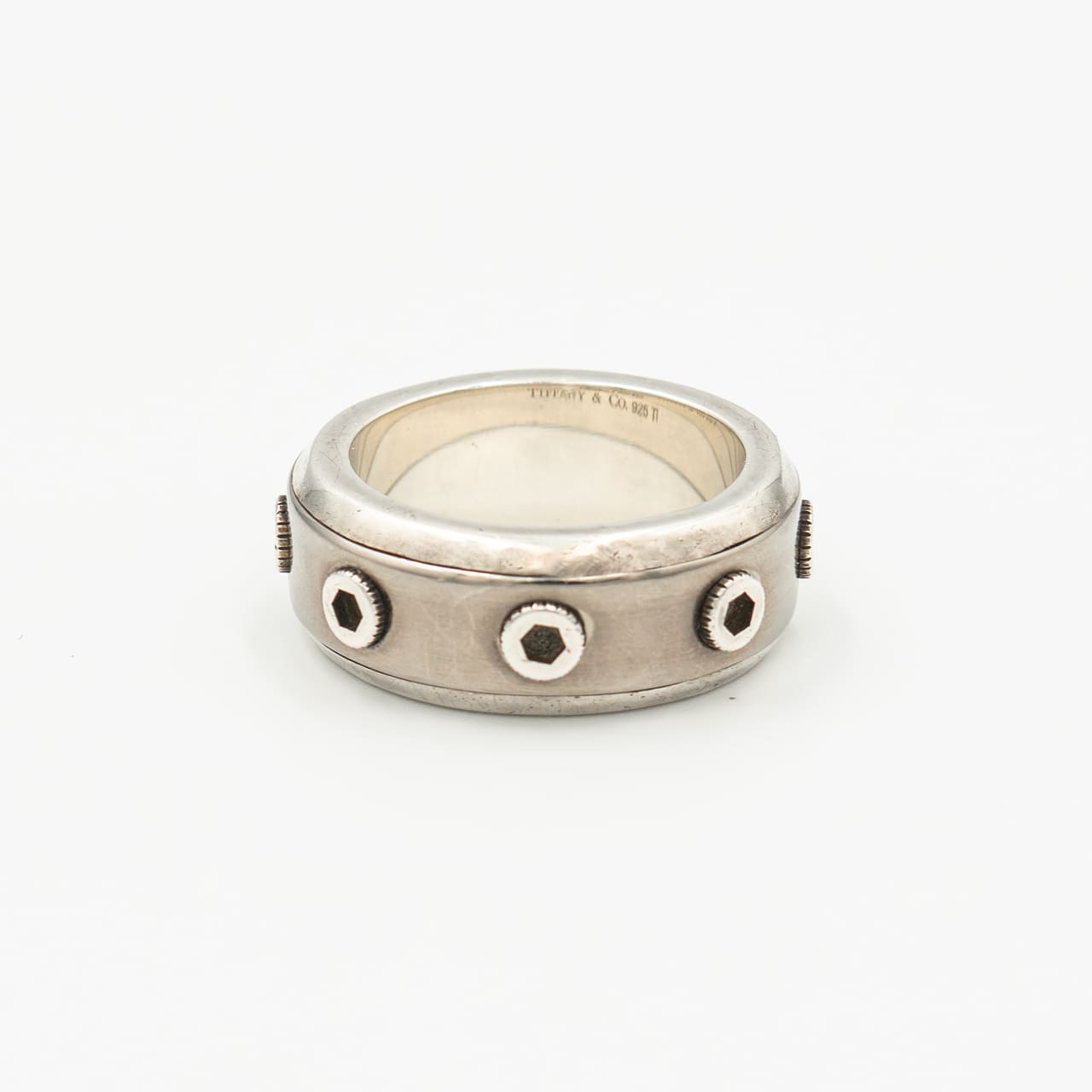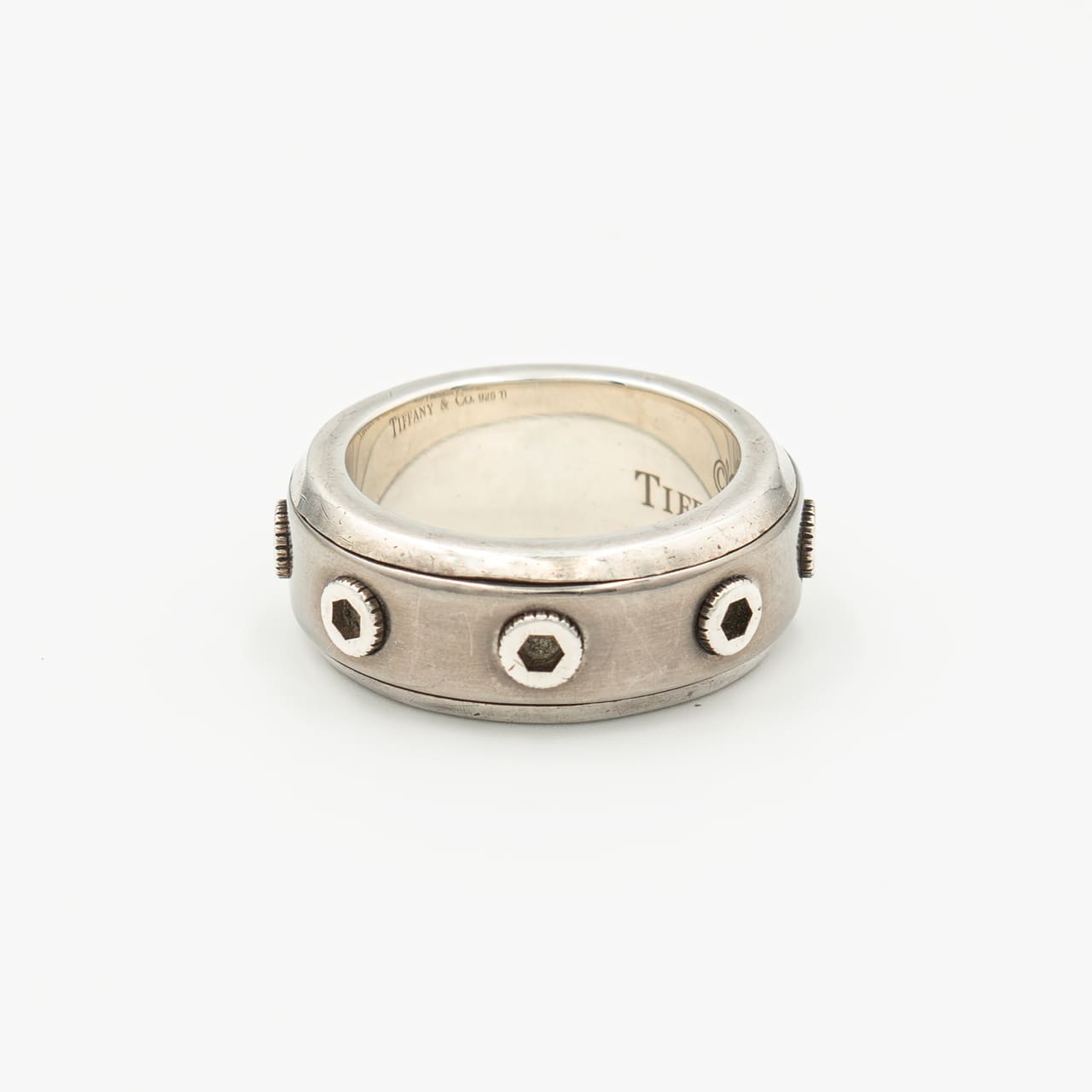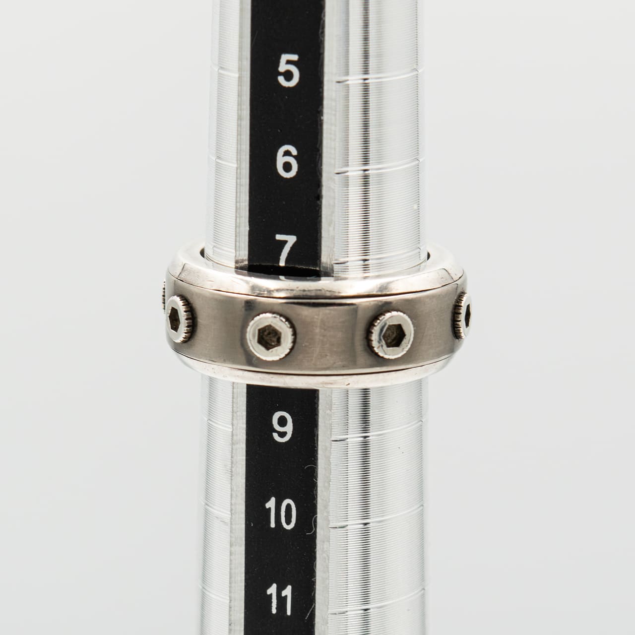 本作はスターリングシルバーとチタンを組み合わせた二層構造のバンドリングです。シルバーは美しく磨き上げたポリッシュ仕上げ、中央のチタンは落ち着いたヘアライン仕上げに整えています。光沢とマット、柔と剛のコントラストが指元で静かに響き合い、装いにモダンな陰影を与えます。チタンインサートは八つの六角ビスでしっかりと固定され、工業的な精密感とジュエリーとしての洗練が心地よく同居します。