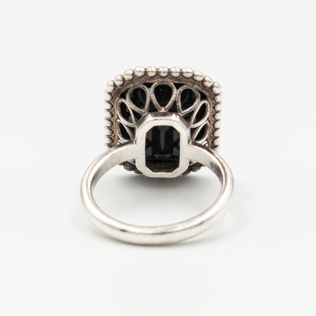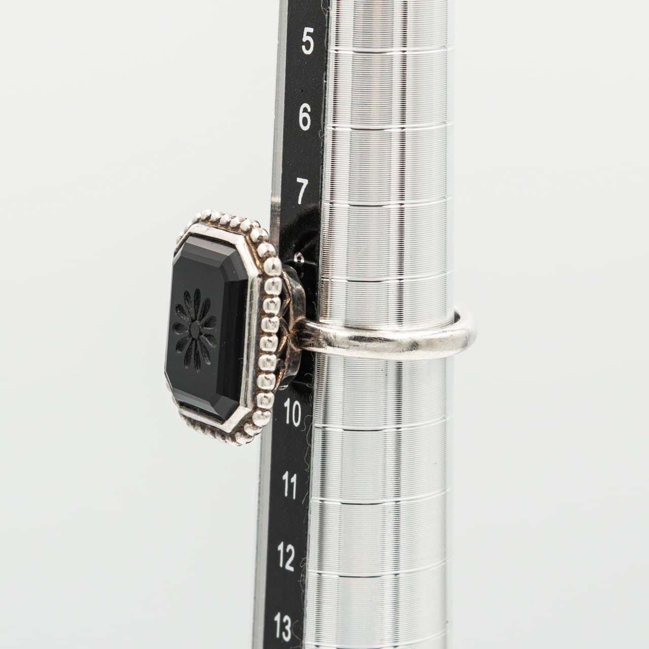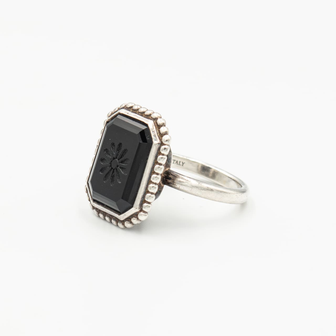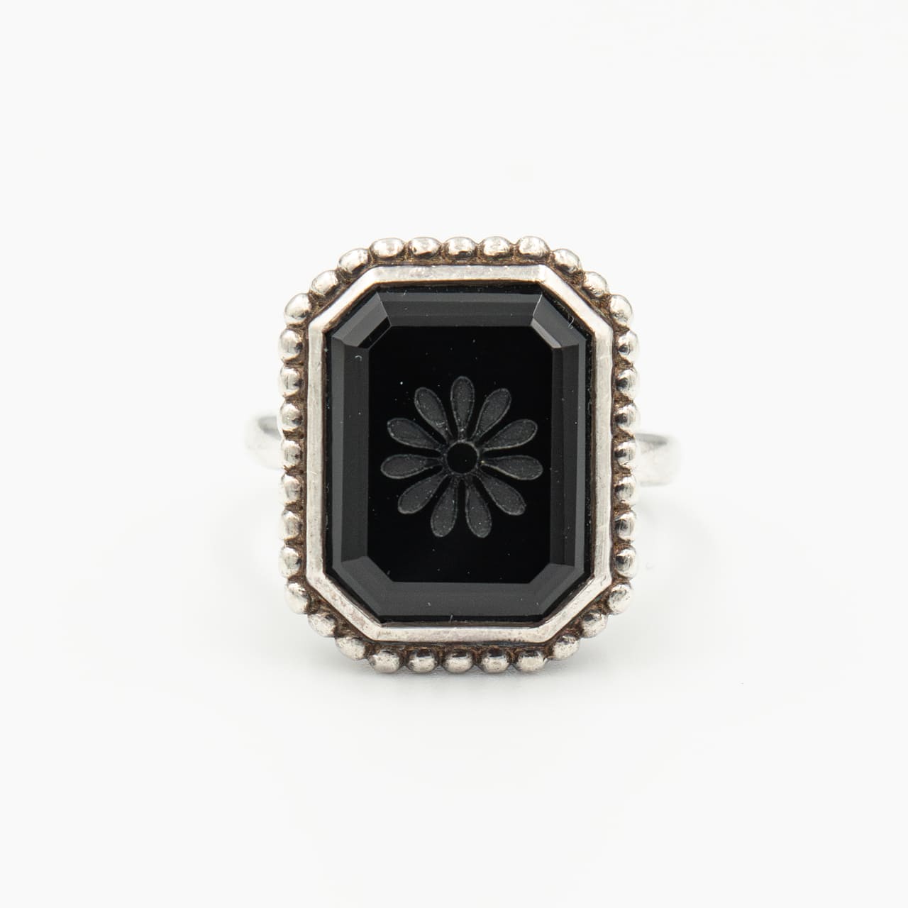 深いブラックのオニキスに、可憐なデイジーをエングレーブしたジーグフェルドコレクションのリングです。光を柔らかく受け止める石の艶と、彫刻的な花の陰影が、指先に上質なムードを添えます。