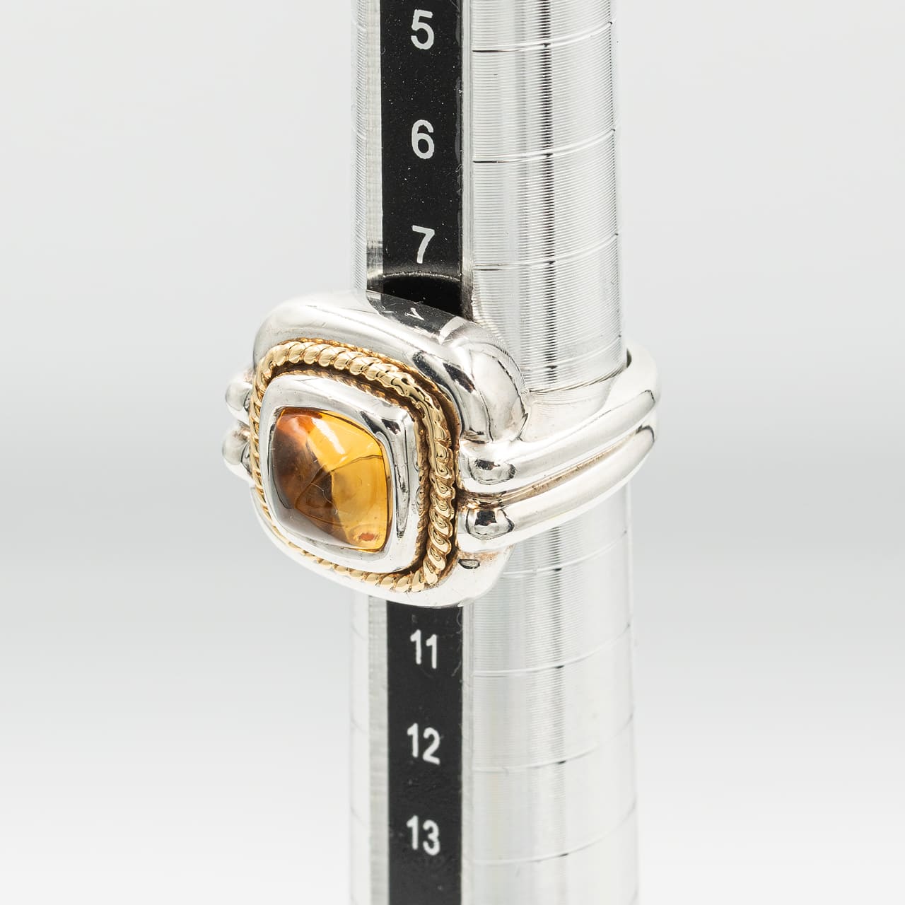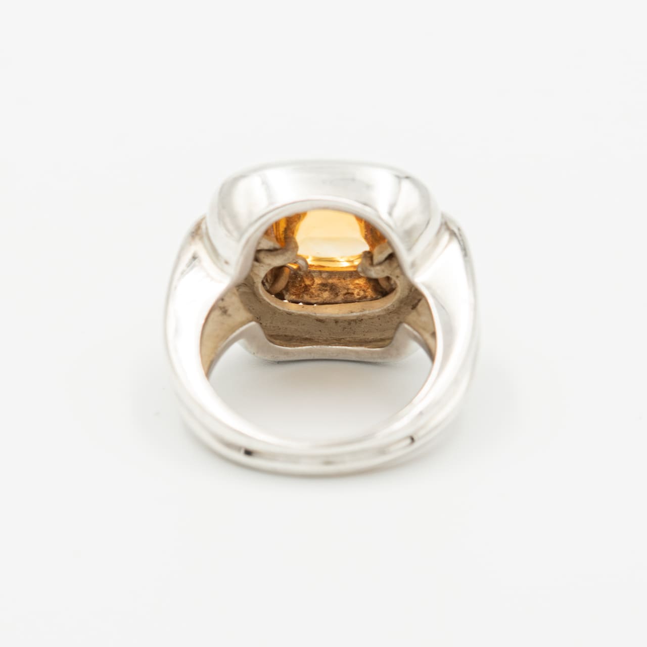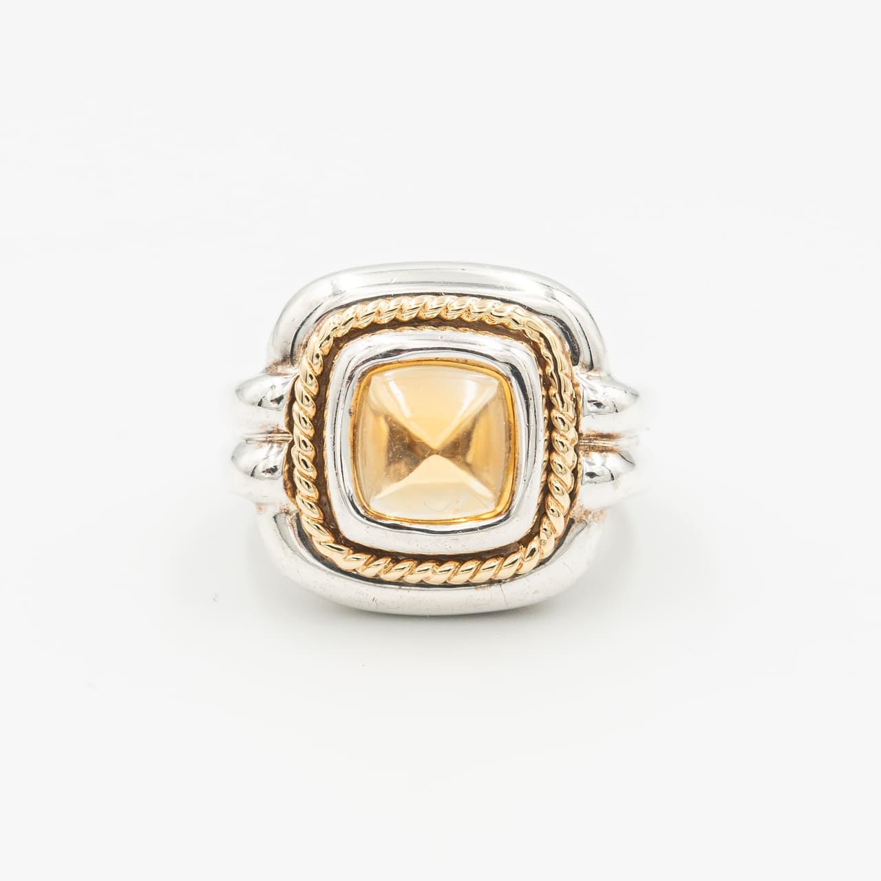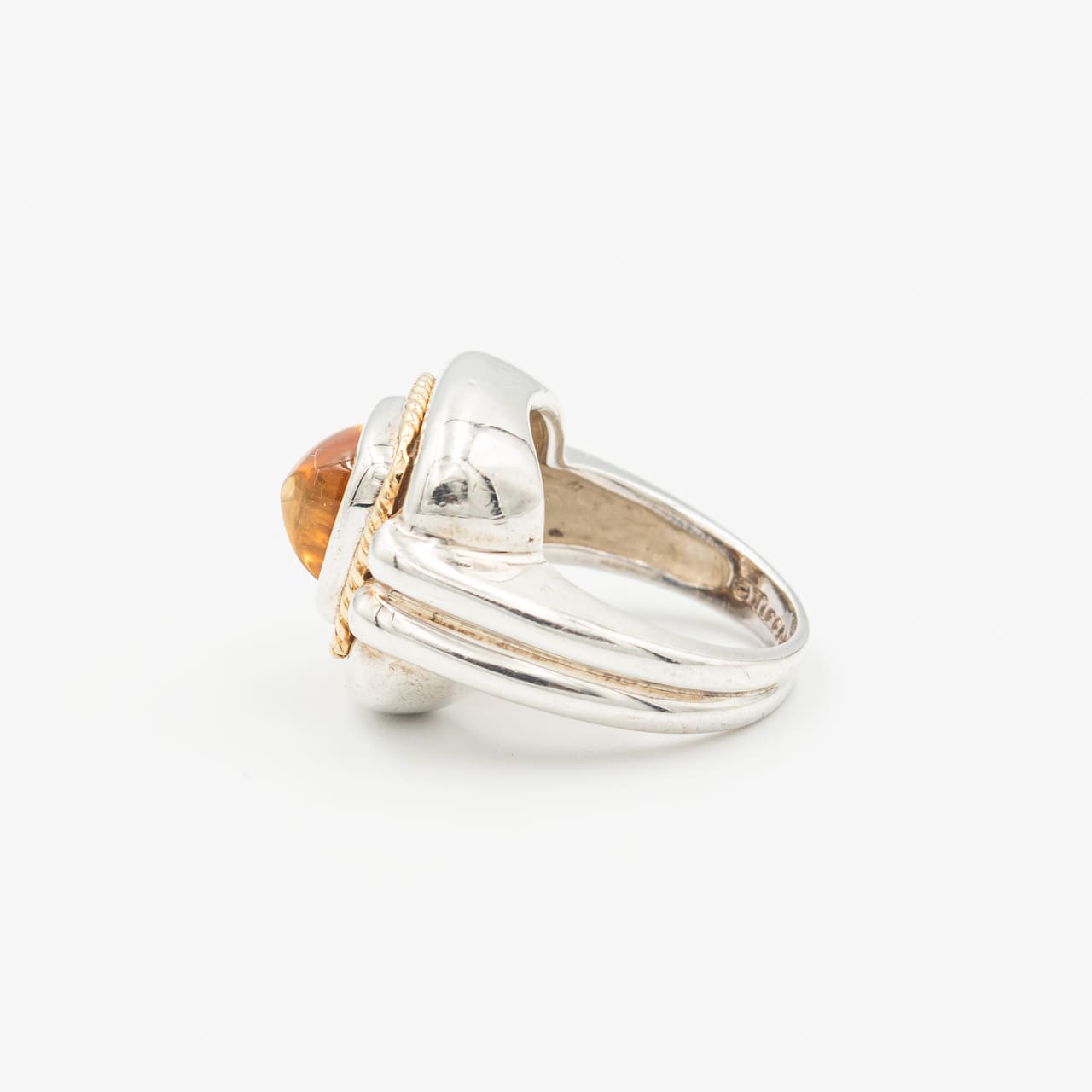 蜂蜜色のシトリンを18Kのベゼルで抱え、土台には端正なスターリングシルバーを用いた二層構成が、色と質感のコントラストを美しく際立たせます。